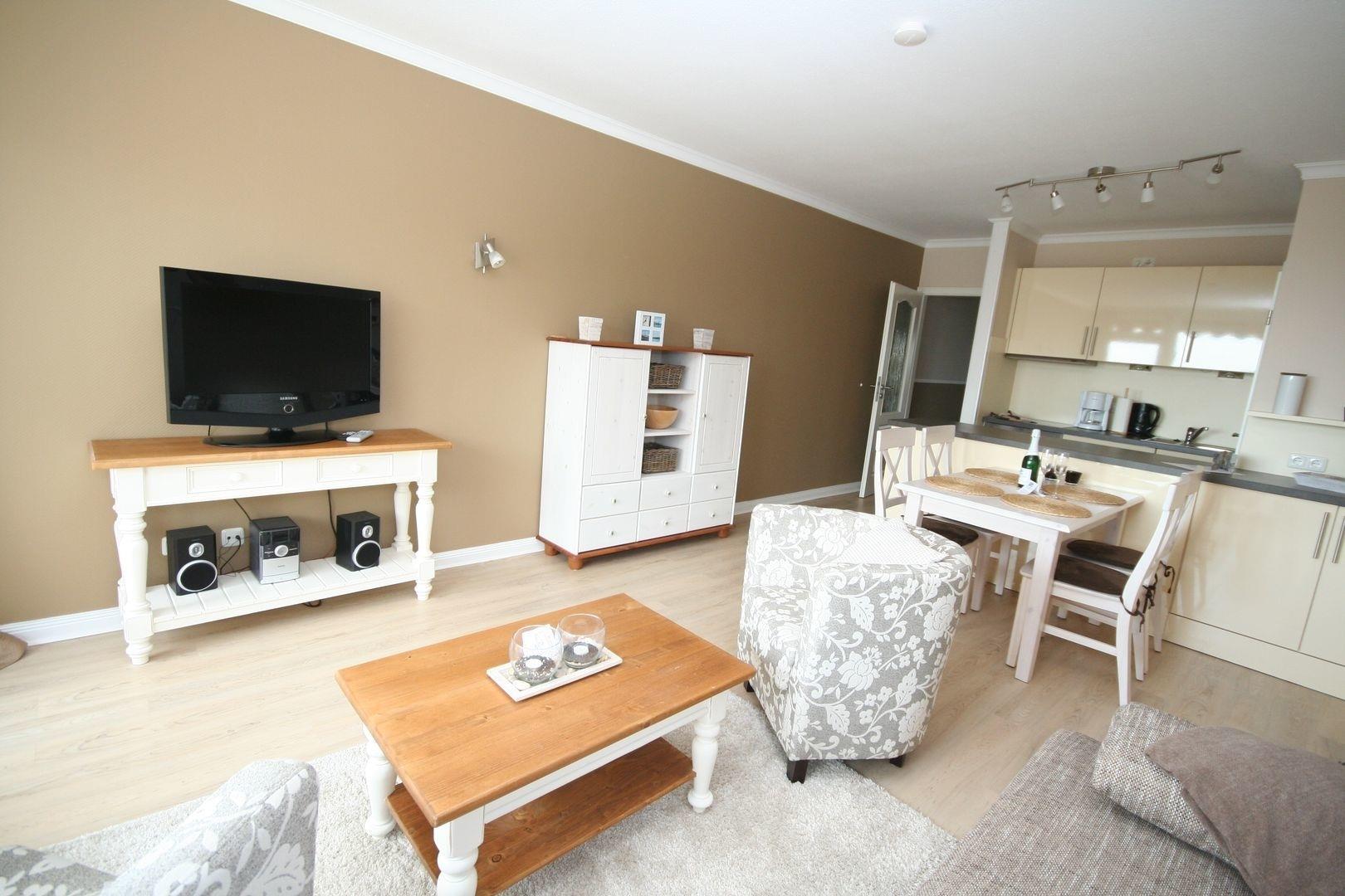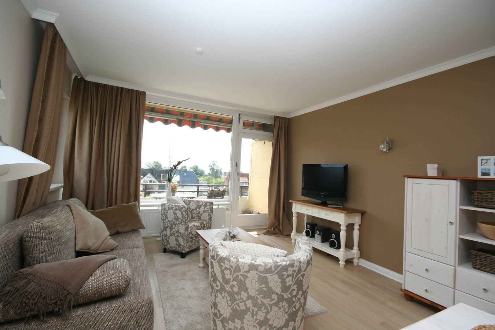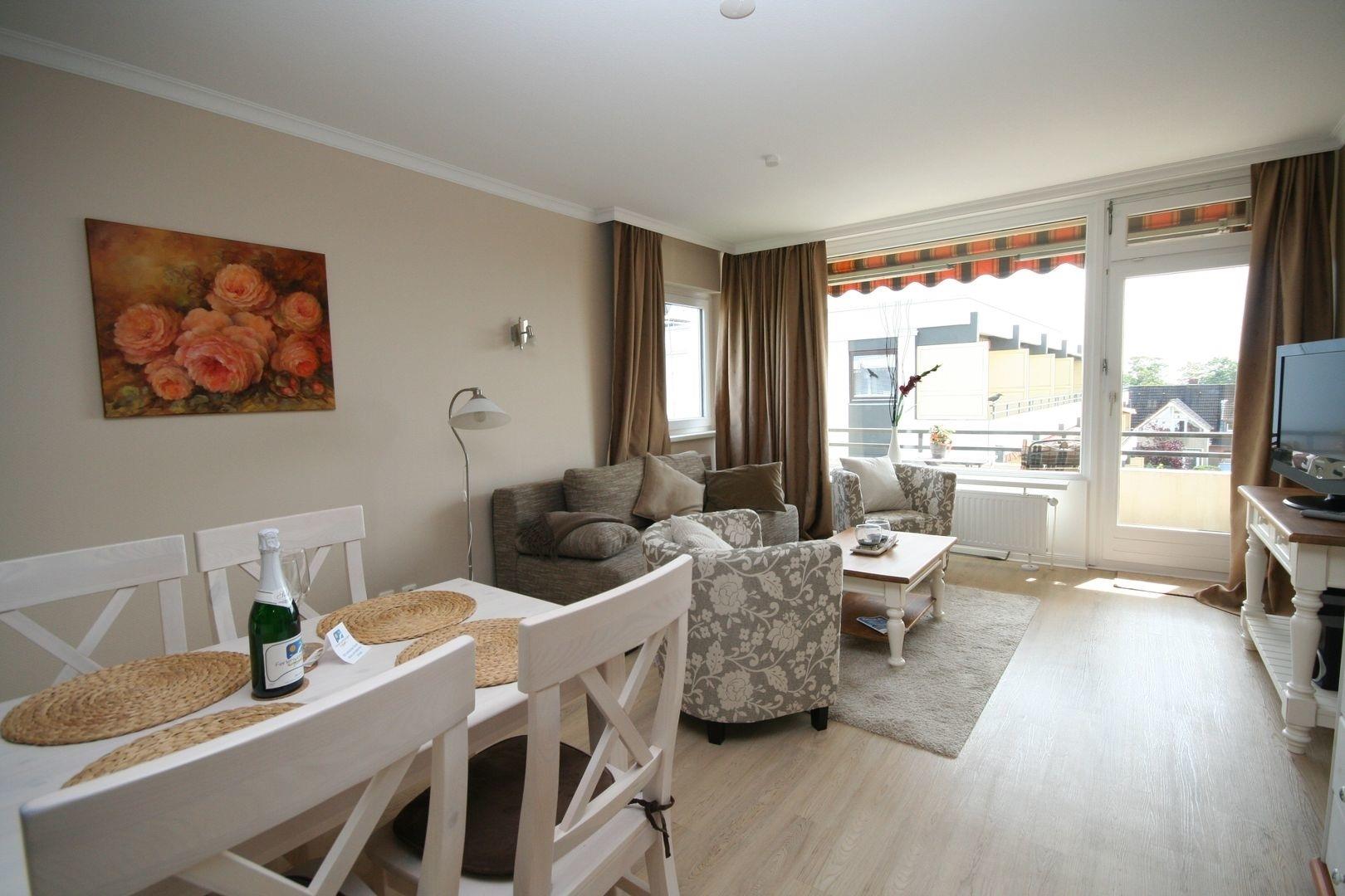 Im hellen, geschmackvollen Wohnbereich befindet sich eine bequeme Couchgarnitur (zum Bett für 2 Pers. ausklappbar), Flach-TV, Radio/CD und Essplatz. Auf dem möblierten, sonnigen Süd-Ost- Balkon können Sie die Sonne richtig genießen.