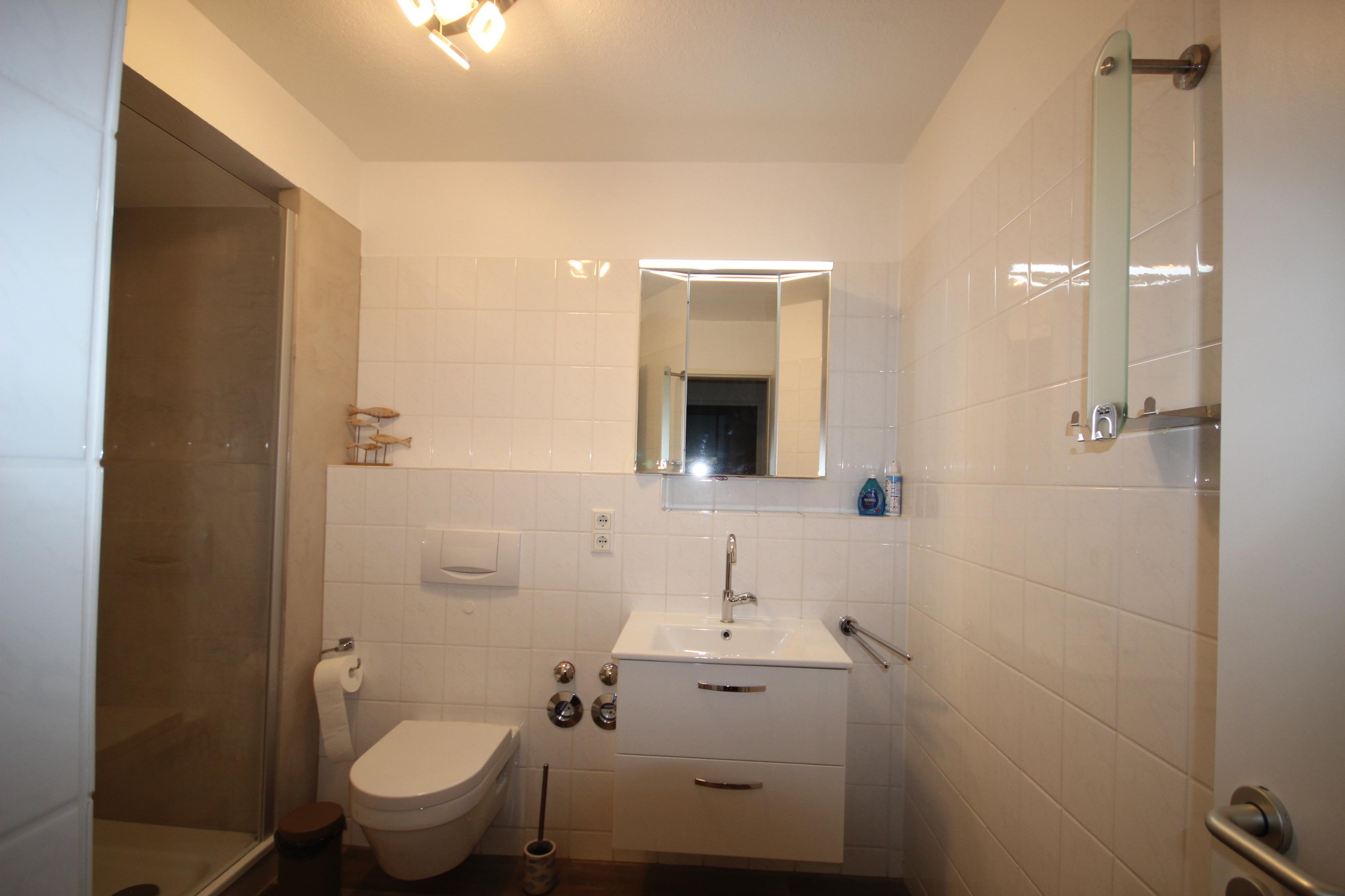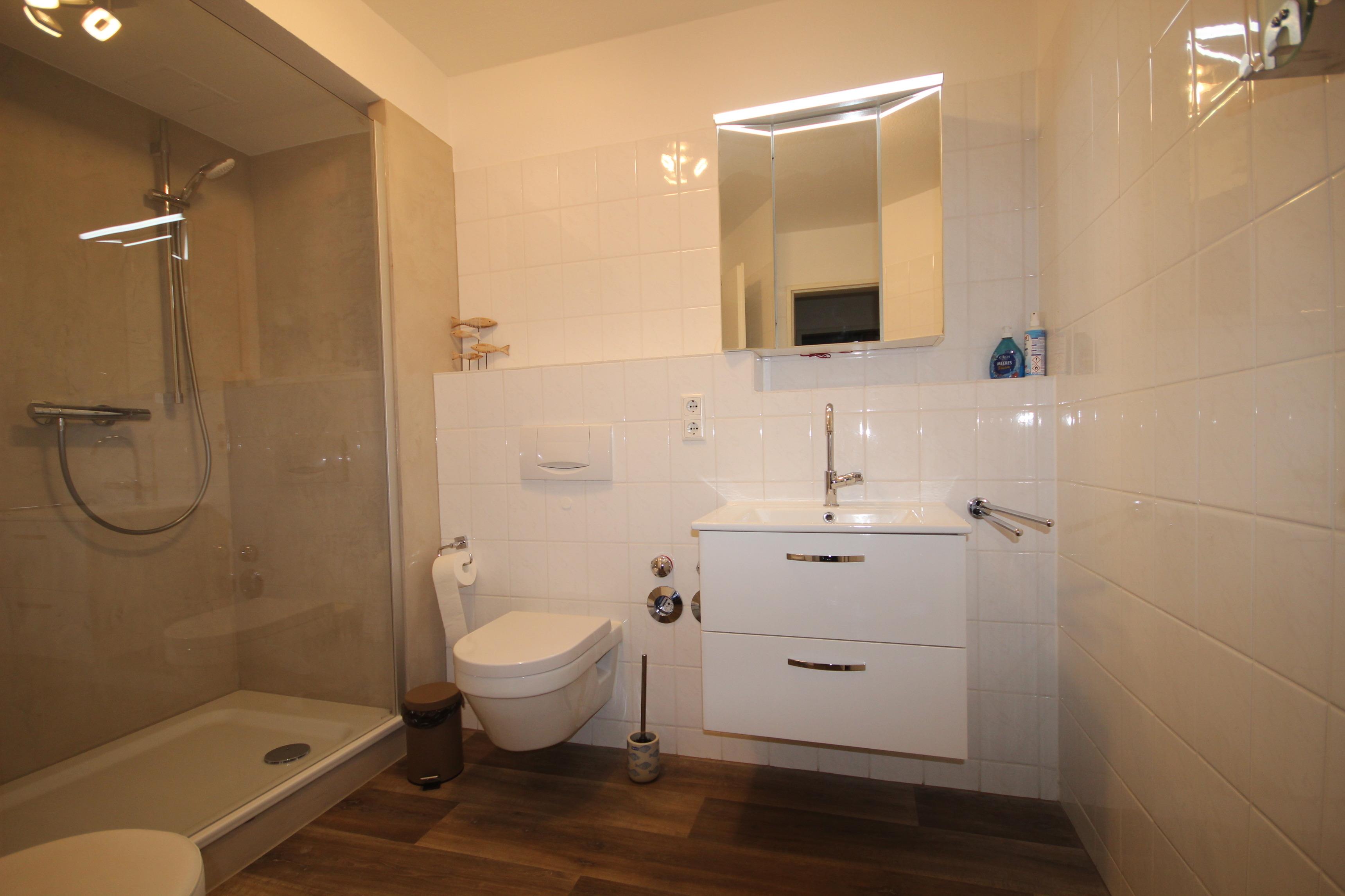 Das helle, innen liegende Badezimmer hat einen großzügig gestallteten Duschbereich mit Glastrennwand, modernen Waschtisch mit Unterschrank, Spiegelschrank und WC.