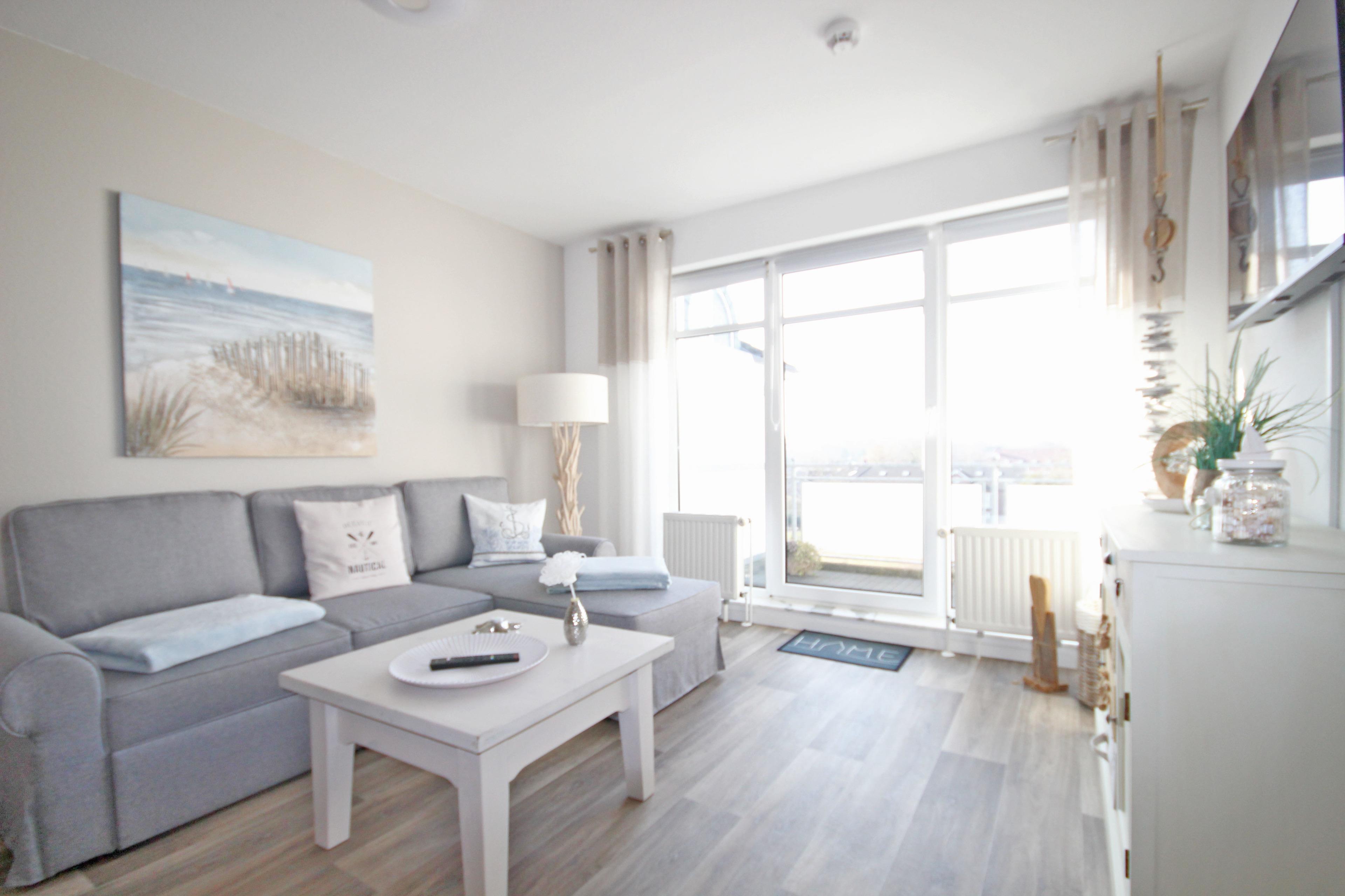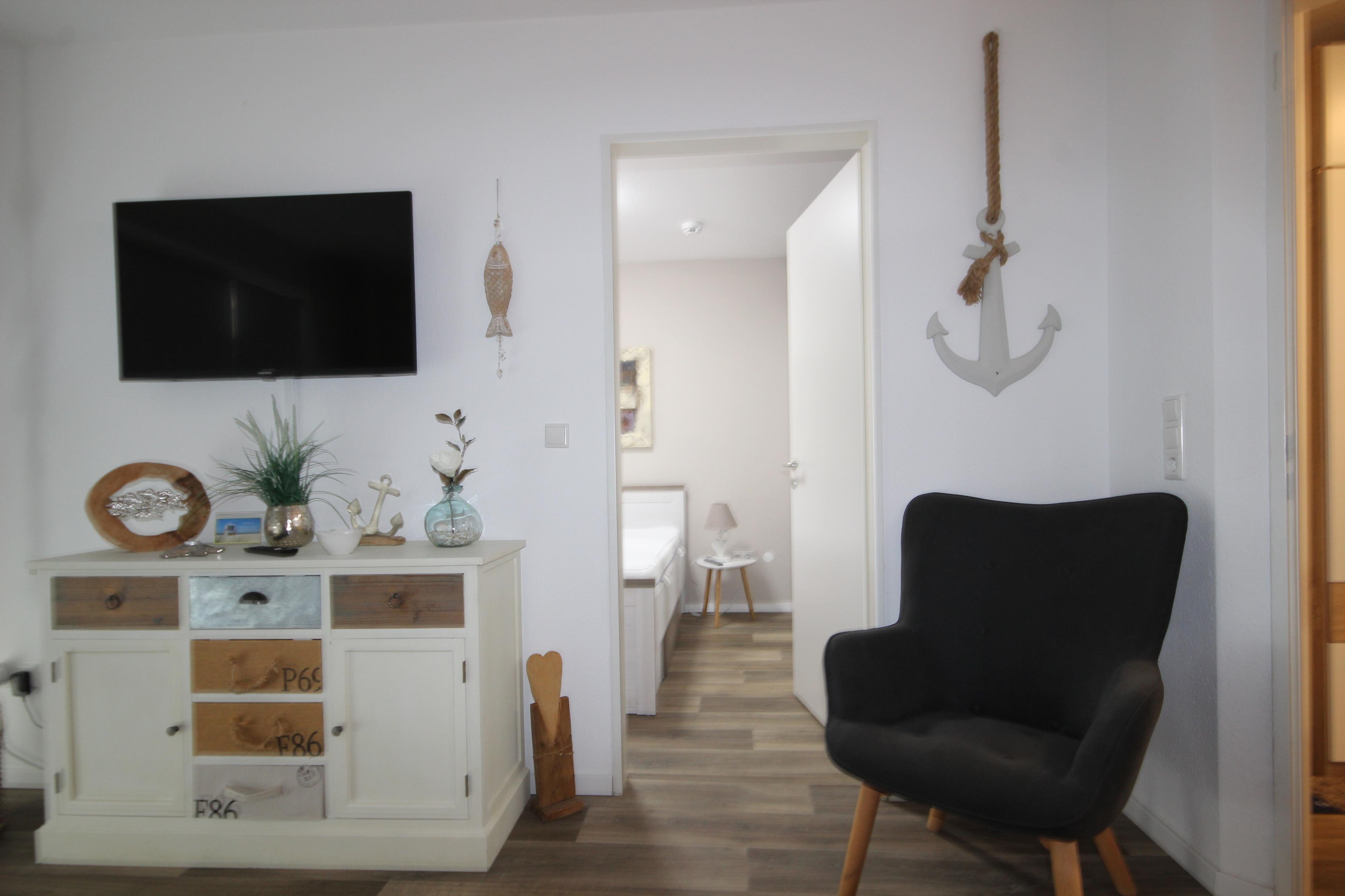Der gemütliche, neu eingerichtete, helle Wohnraum ist mit einer Couch (ausziehbar als Bett für 1 Personen), Sideboard, Essplatz, TV & Radio ausgestattet. Hier haben Sie Zugang zum sonnigen, möblierten Süd-Balkon.