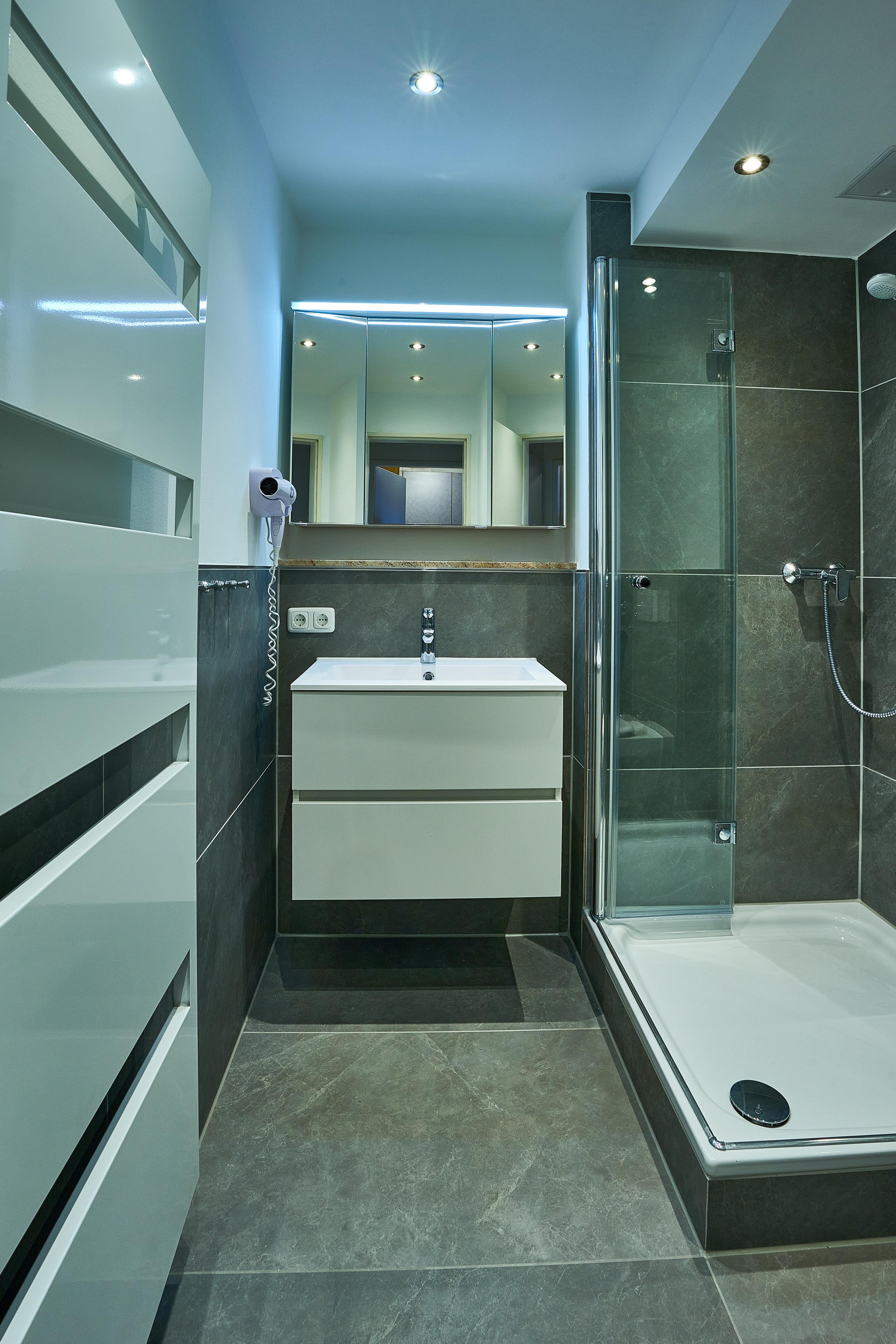 Das moderne, innen liegende Bad hat eine Dusche mit Duschkabine, WC und Waschbecken.