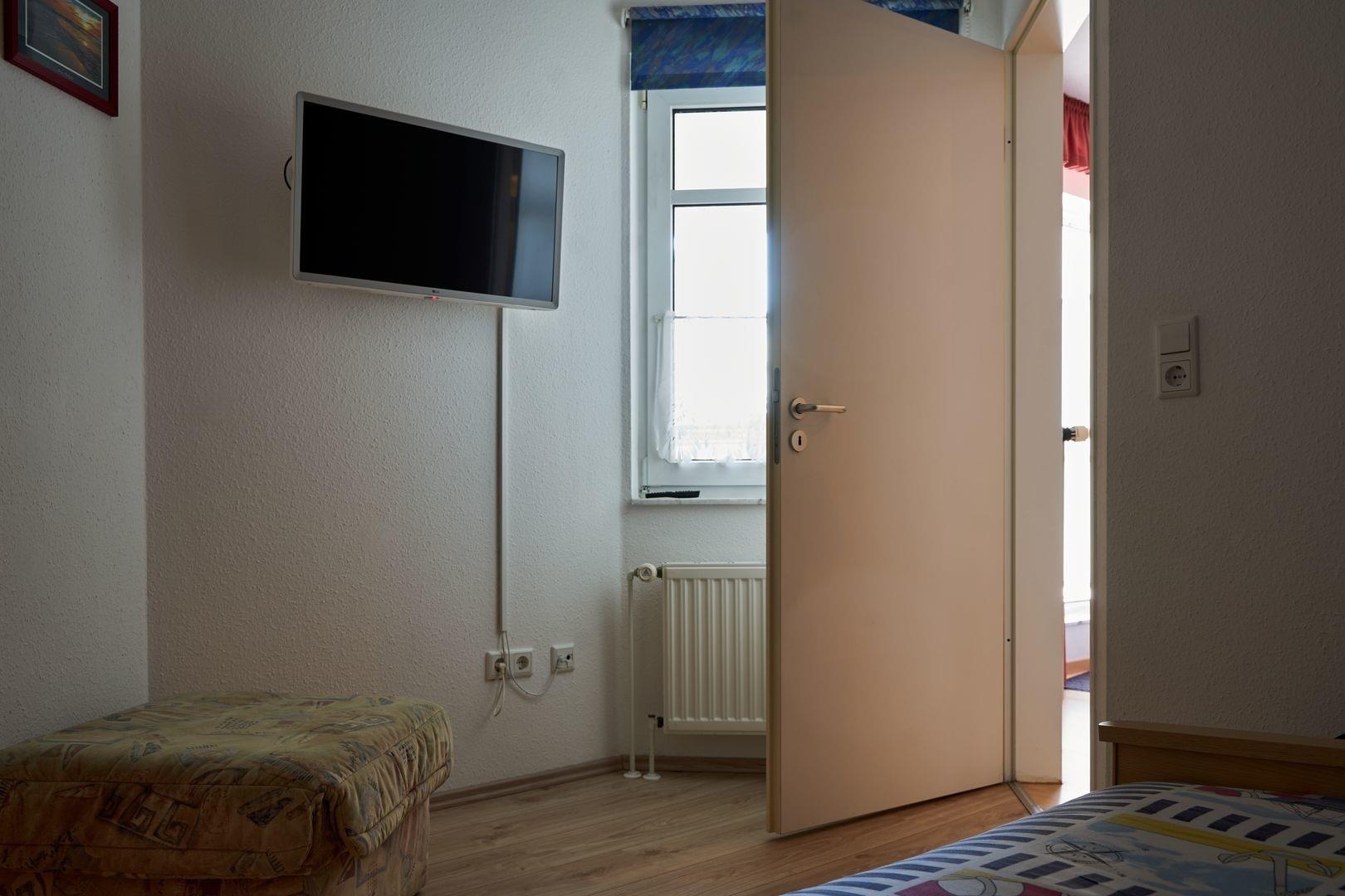 Das Schlafzimmer verfügt über ein Doppelbett, Kleiderschrank, Flachbild-TV.
