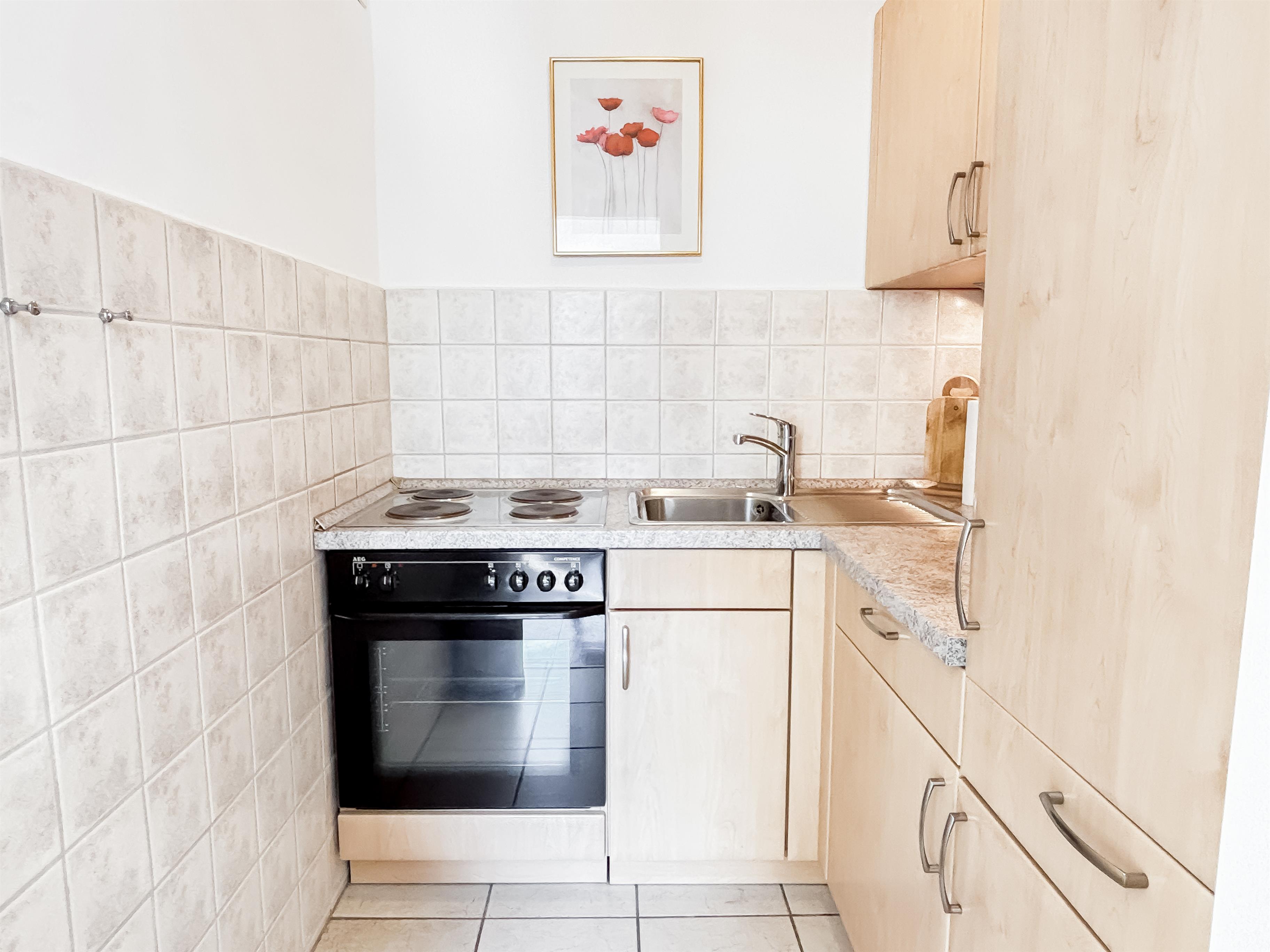 Die innenliegende, helle Küche ist mit E-Herd & Backofen, Kühlschrank mit Gefrierfach und den üblichen Küchengeräten gut ausgestattet.