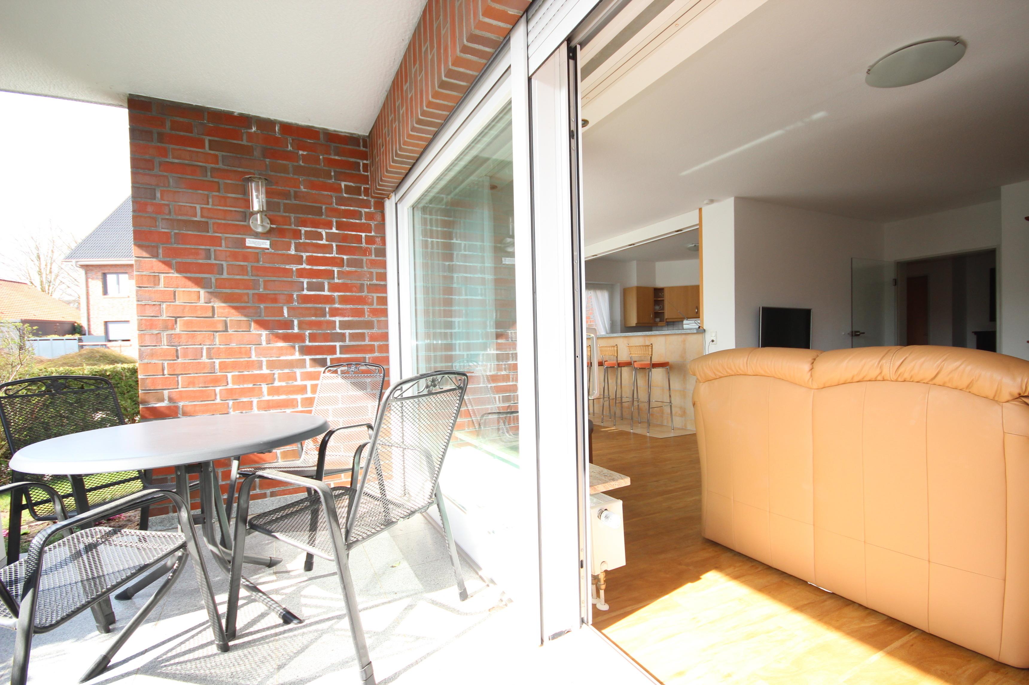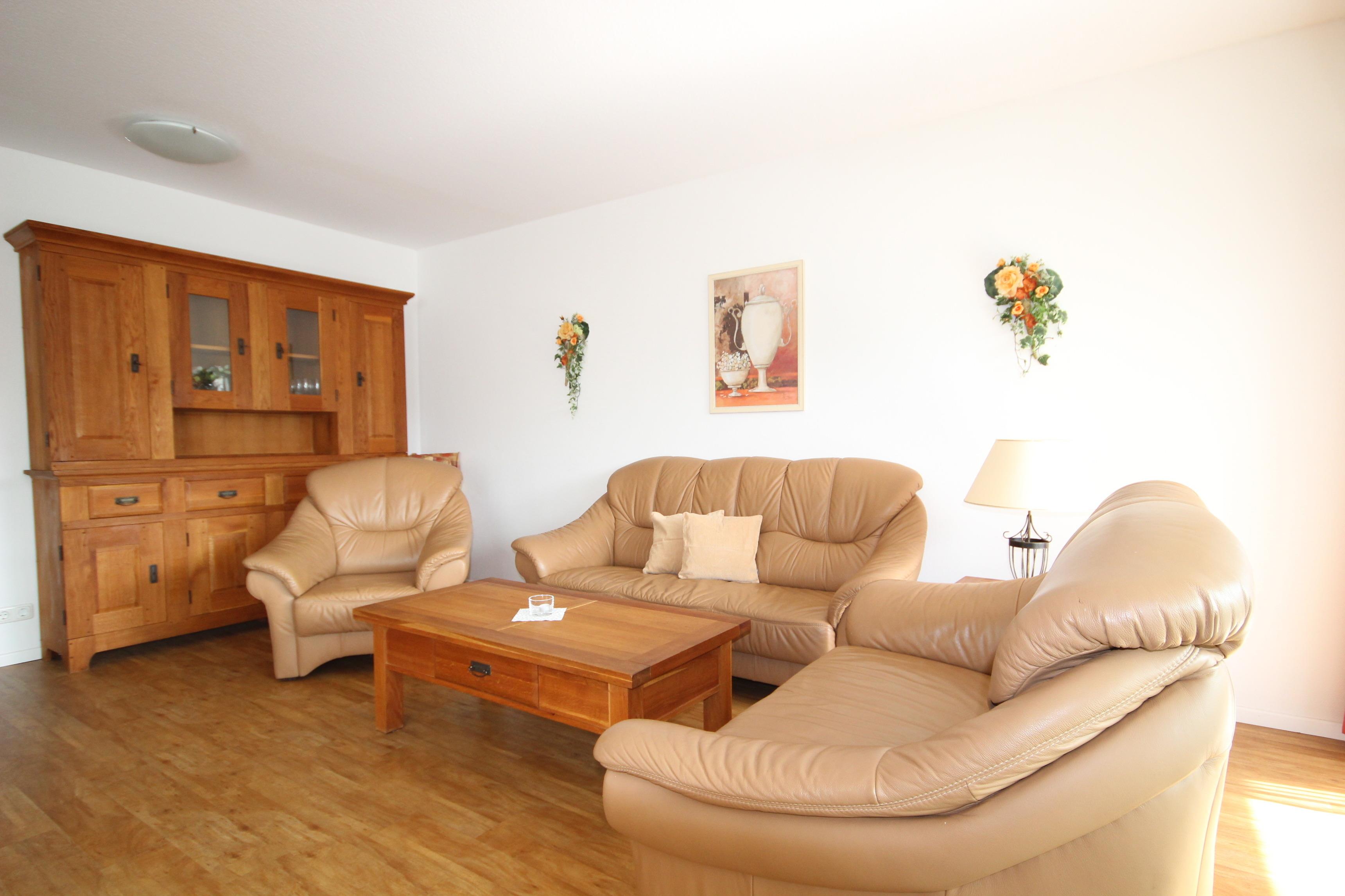 Im hellen Wohnbereich befindet sich eine gemütliche Ledergarnitur, Massivholzmöbel, Essplatz & TV. Hier ist der Zugang zur möblierten Süd-Terrasse.