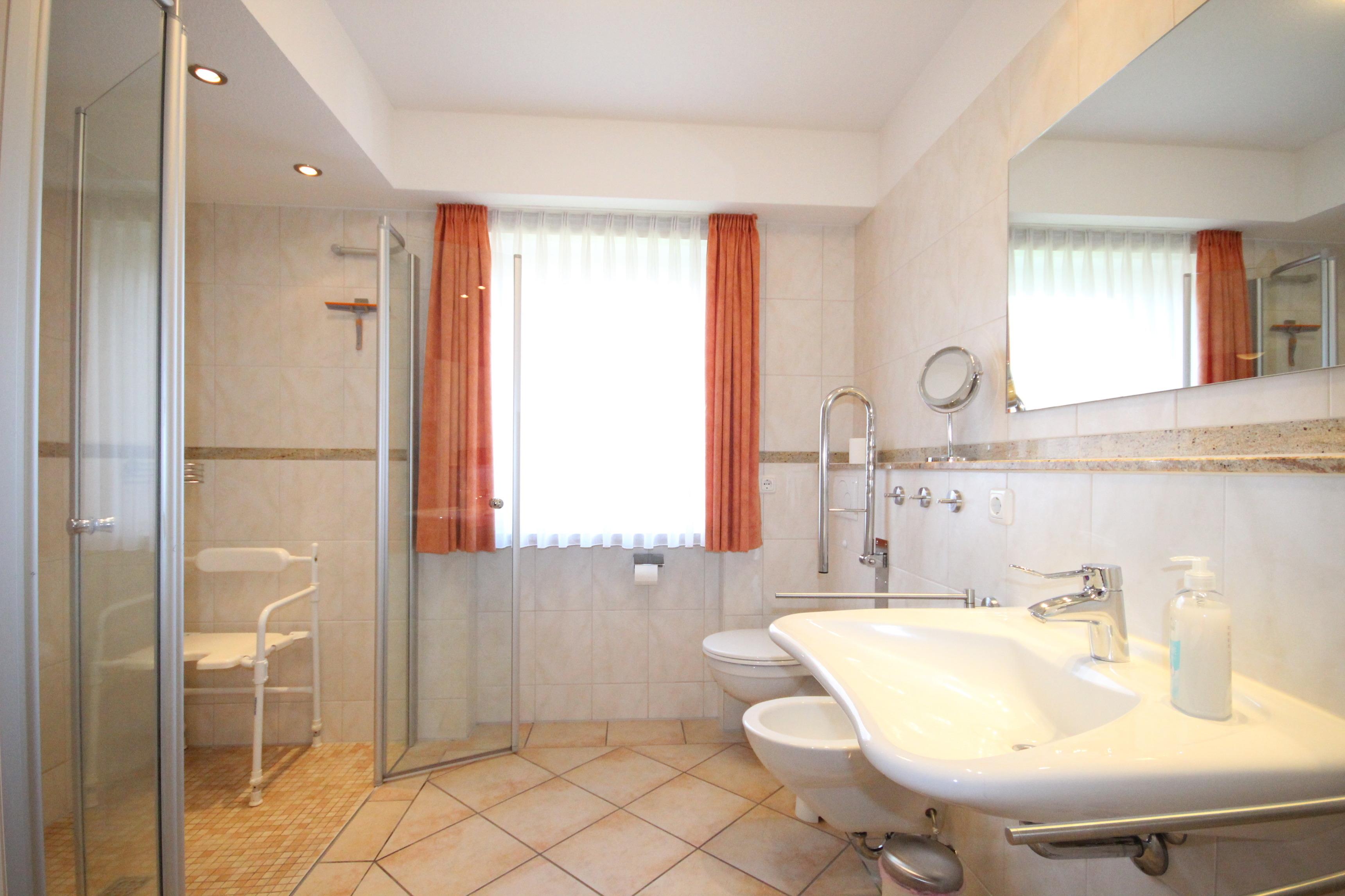 Ein barrierefreies Bad mit großzügiger Dusche, WC, Waschtisch und Bidet.