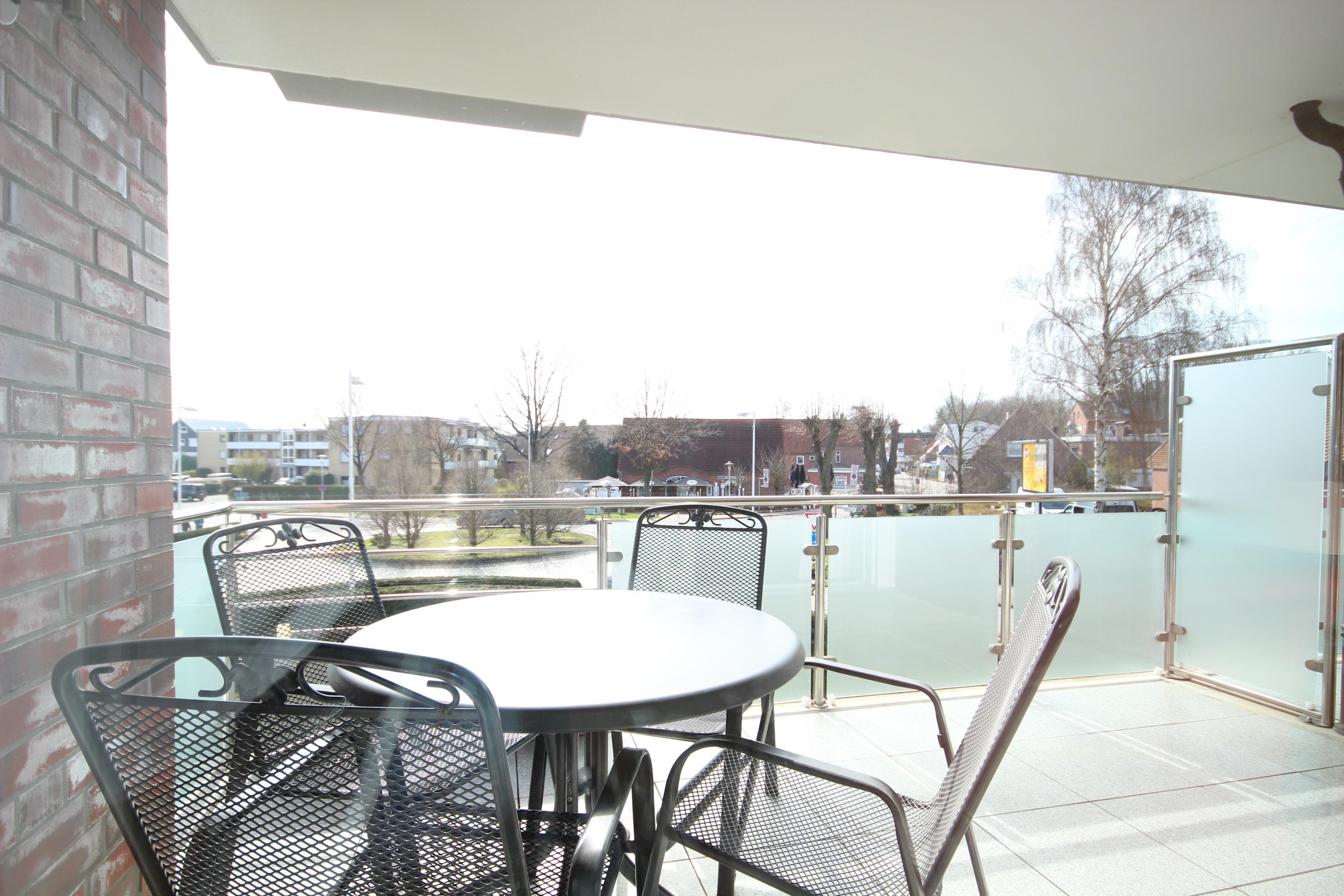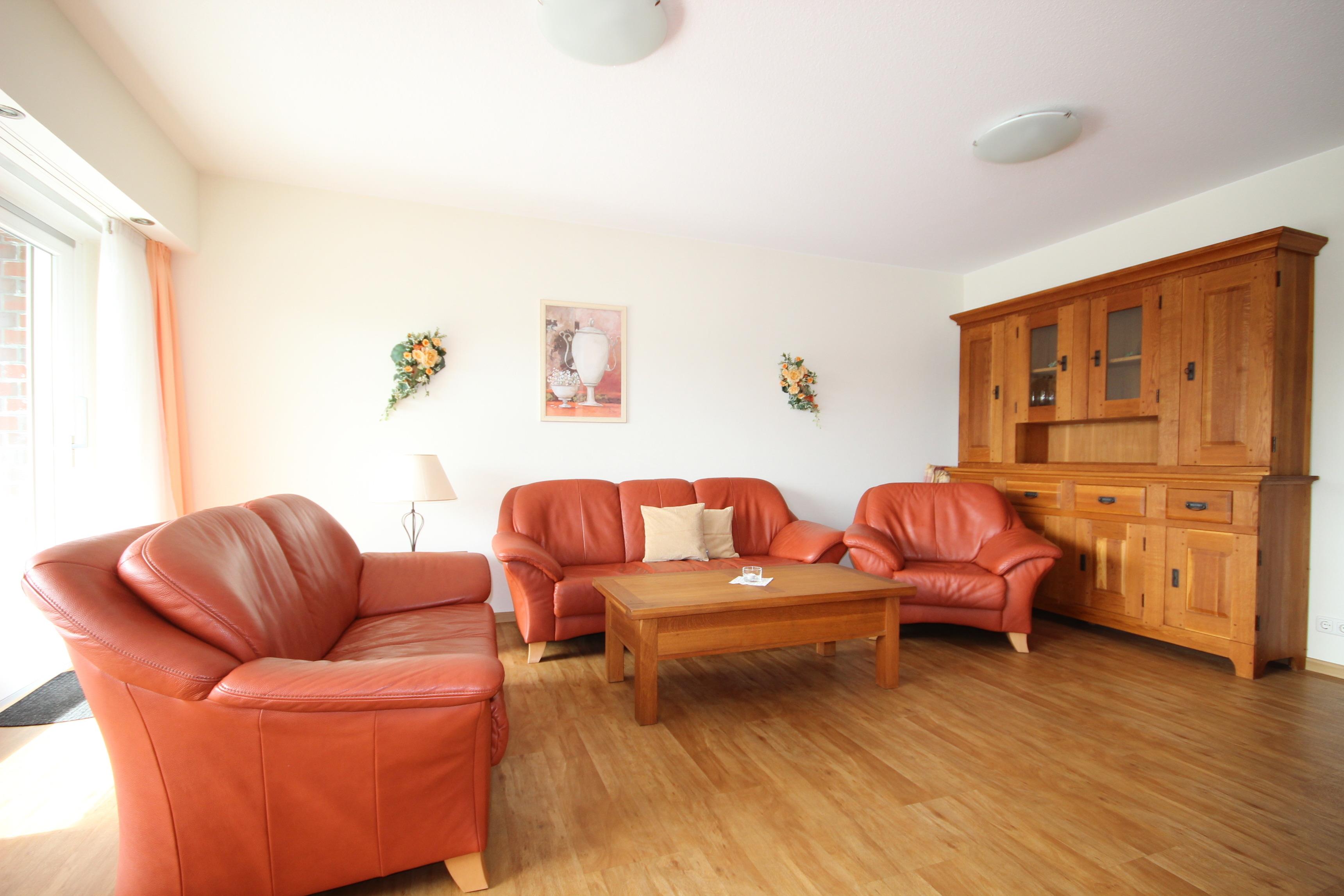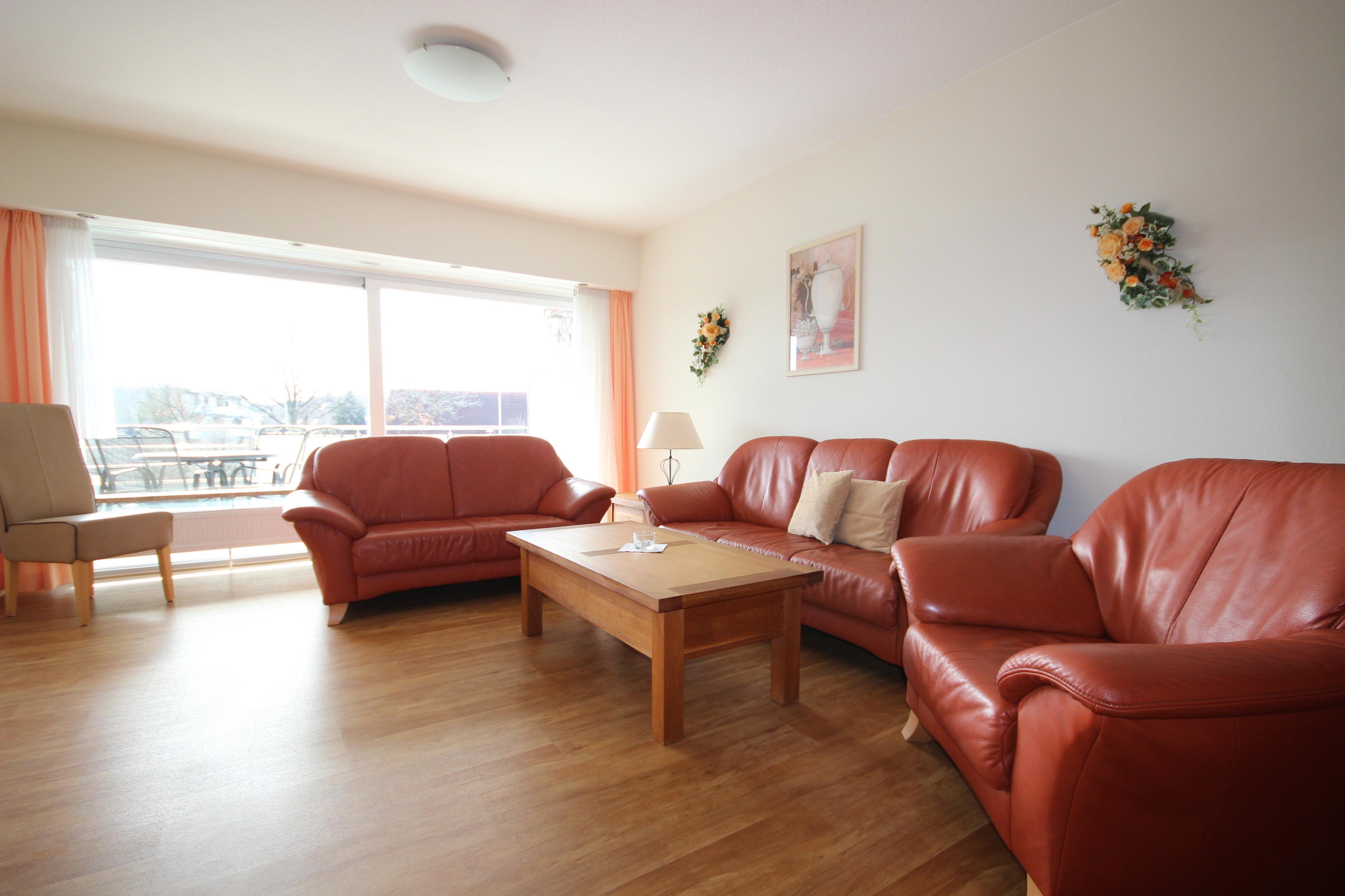 Der gemütliche Wohnbereich ist ausgestattet mit einer bequemen Ledergarnitur, Massivholzmöbeln, Essplatz & Fernseher sowie Zugang zum sonnigen, möblierten Süd-Balkon.