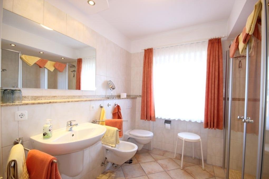 Helles Bad mit großer Dusche, WC, Waschtisch & Bidet.