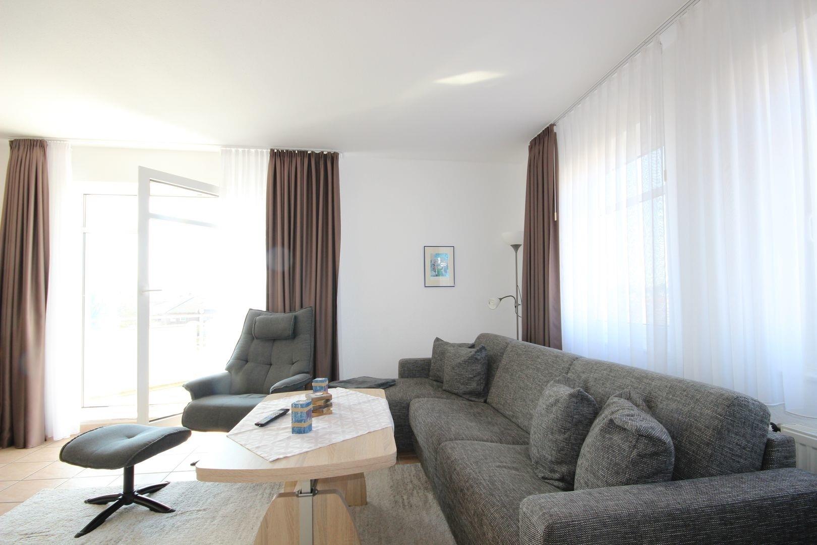 Der schön geschnittene Wohnraum ist mit einer gemütlichen Couchgarnitur (ausziehbar als Bett für 2 Pers.), Schränken, Essplatz, TV und Radio modern eingerichtet. Hier haben Sie Zugang zum sonnigen, möblierten Süd-West-Balkon.