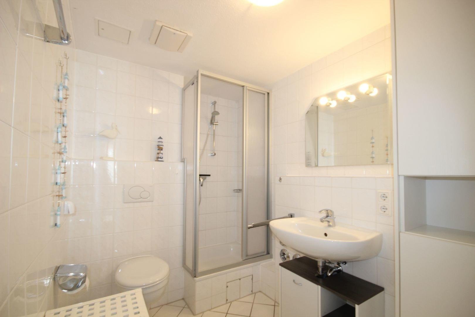 Das moderne, helle Badezimmer hat eine Duschkabine, WC & Waschtisch.