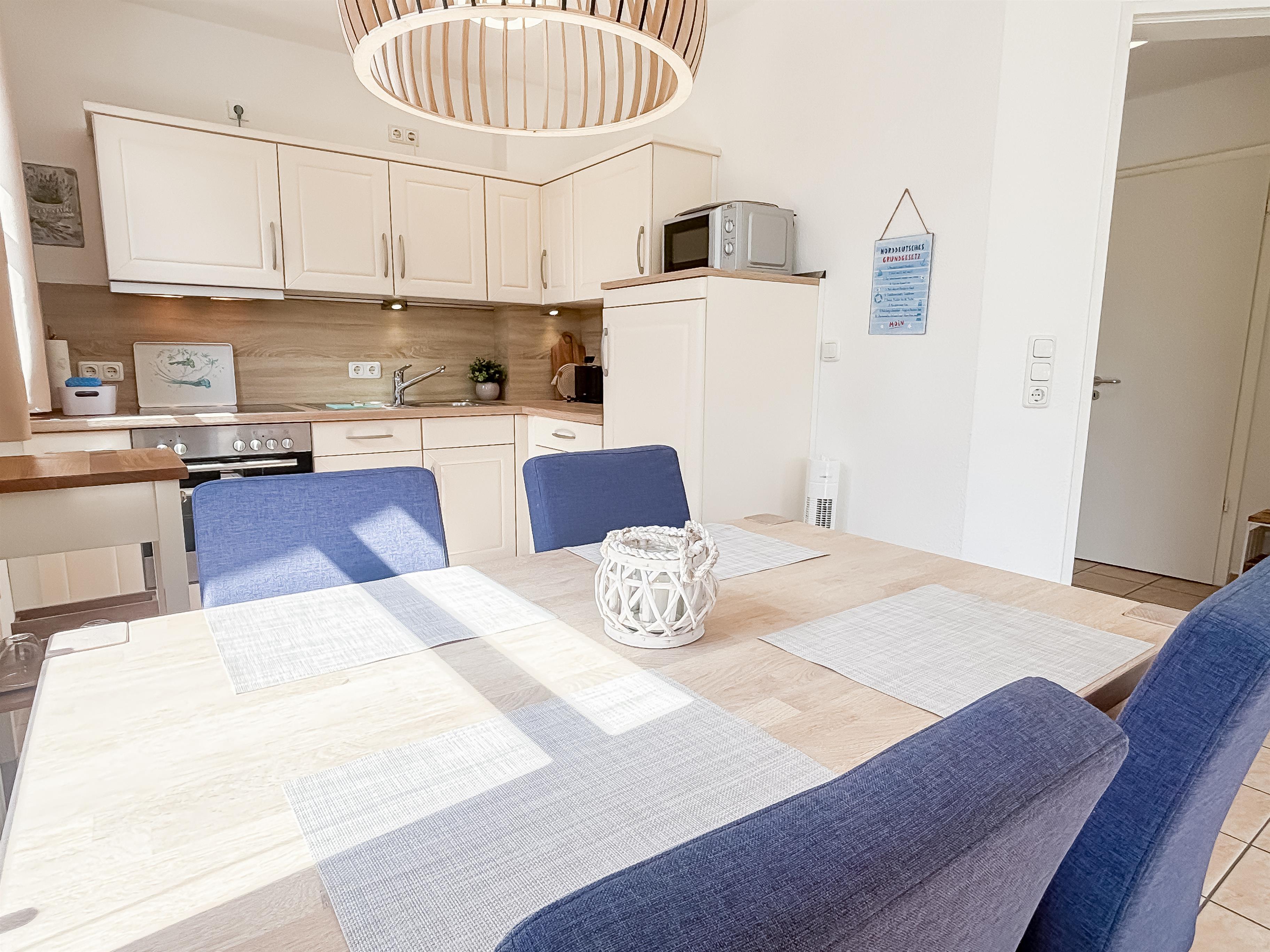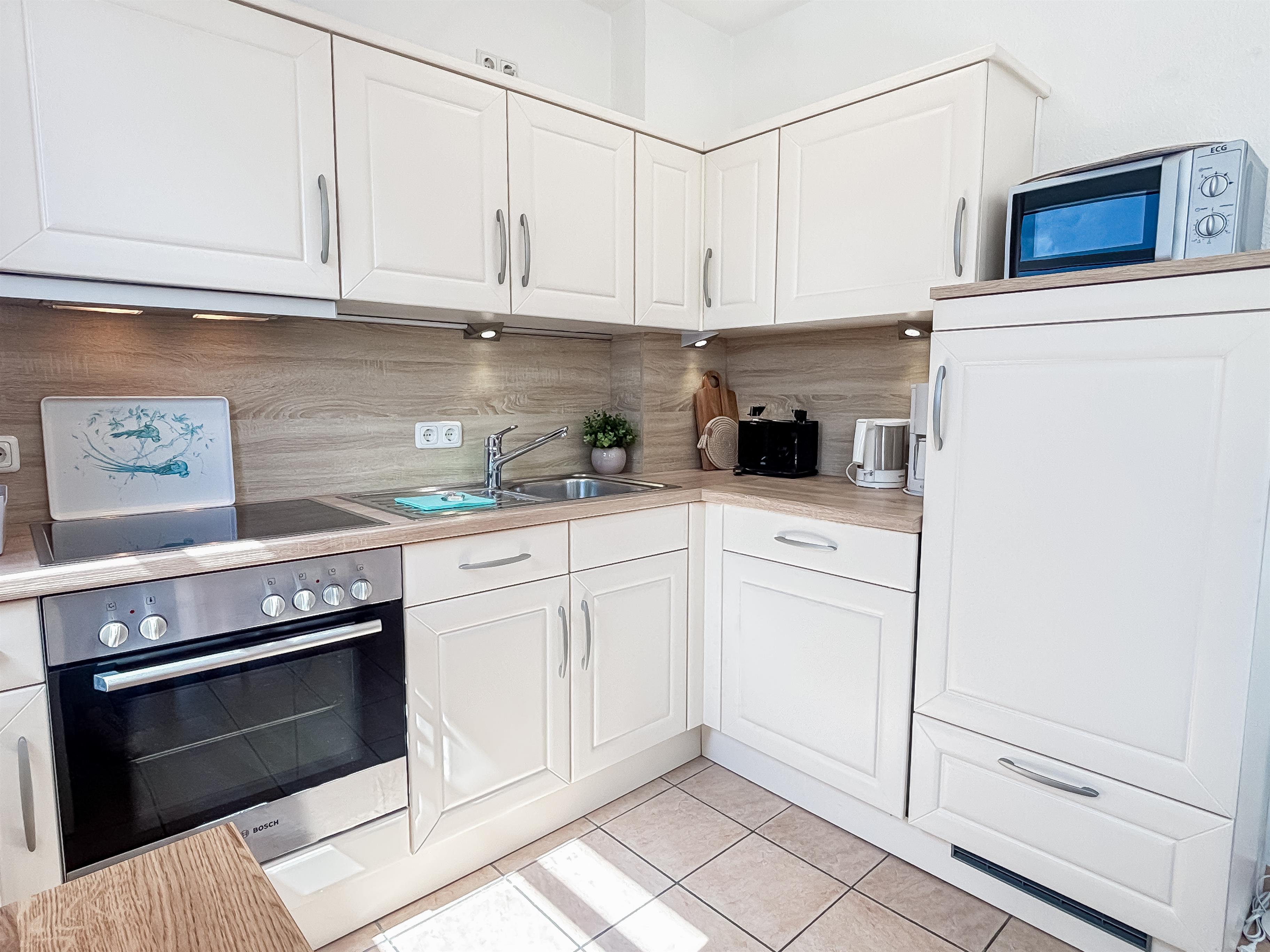 Die angrenzende, offene Küche mit Geschirrspüler, Backofen, Cerankochfeld, Kühlschrank mit Gefrierfach, Mikrowelle sowie allen üblichen Küchengeräten ist sehr gut ausgestattet.