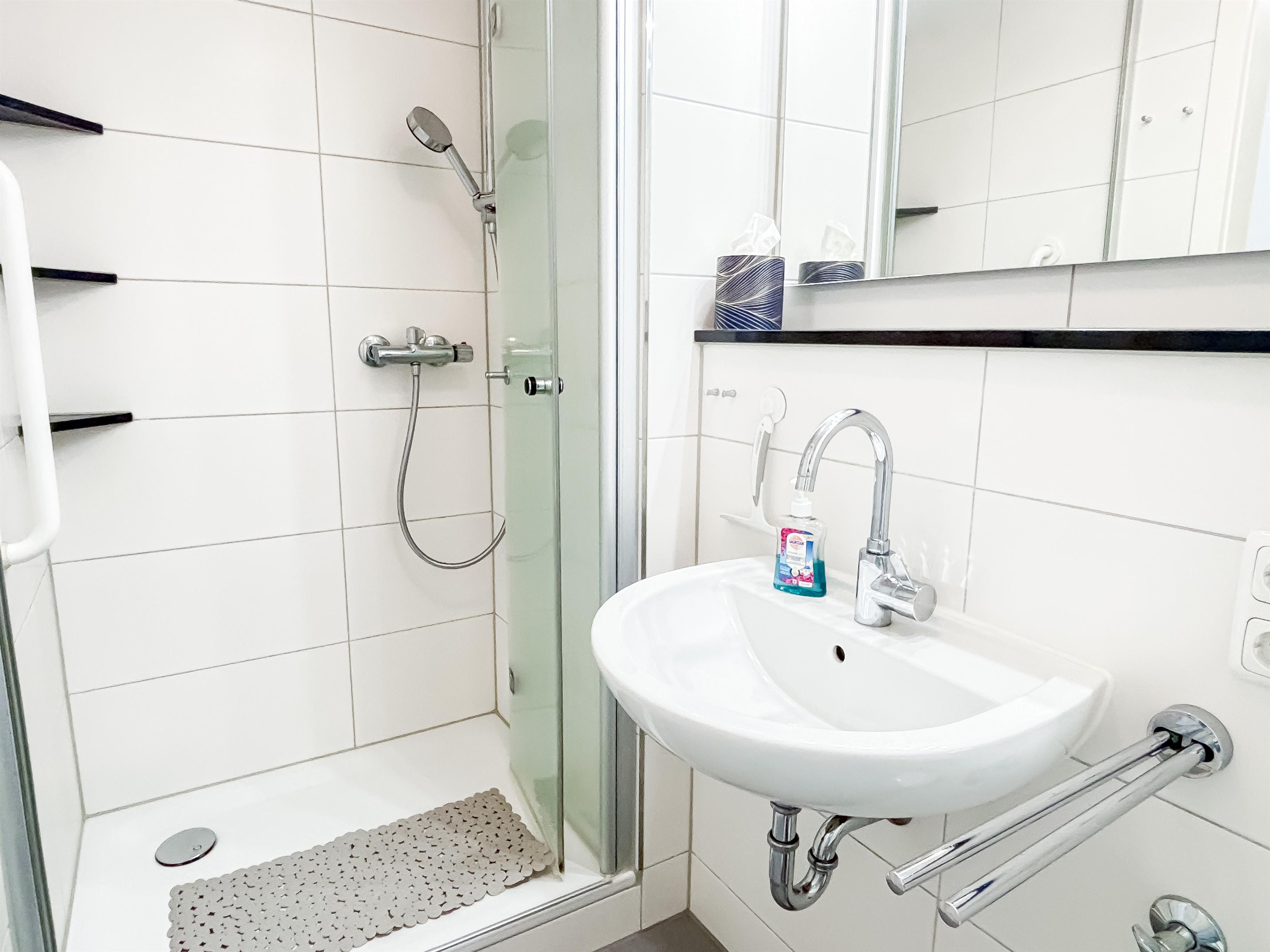 Das moderne, weiße Badezimmer hat eine geräumige Dusche, Waschbecken & WC.