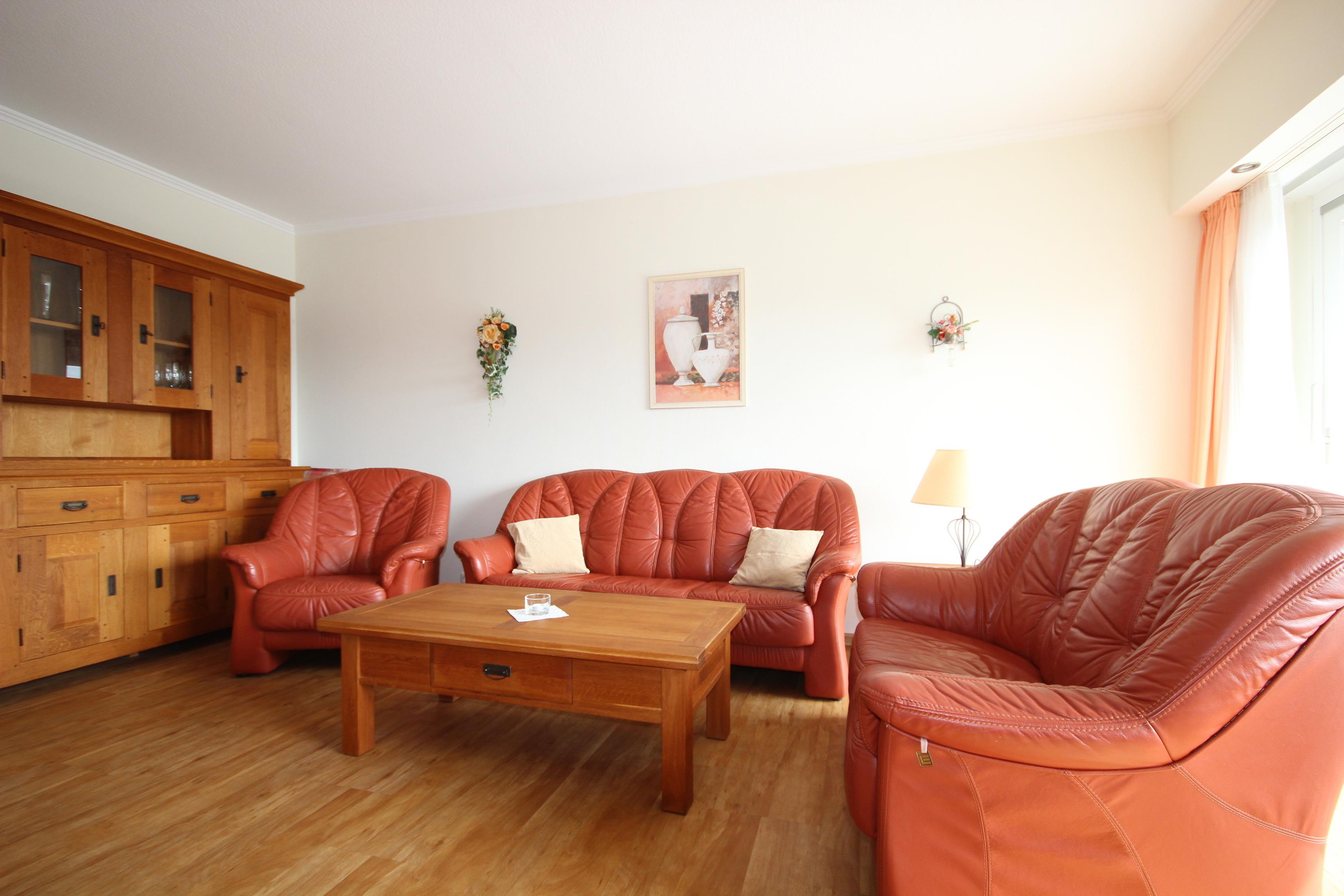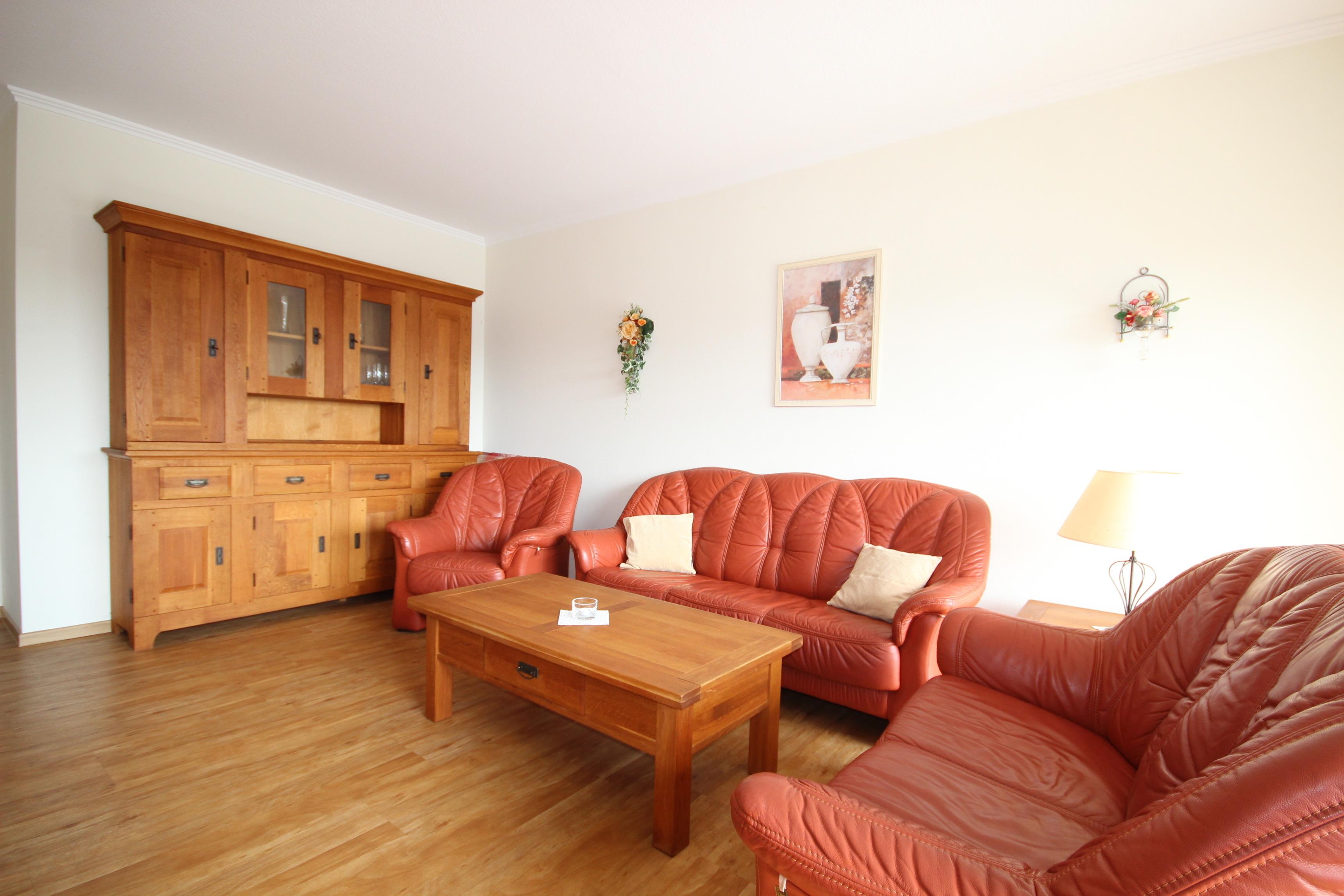 Im gemütlichen Wohnbereich finden Sie eine bequeme Ledergarnitur, Massivholzmöbel, Essplatz für 4 Personen & Fernseher sowie Zugang zum sonnigen, möblierten Süd-Balkon vor.