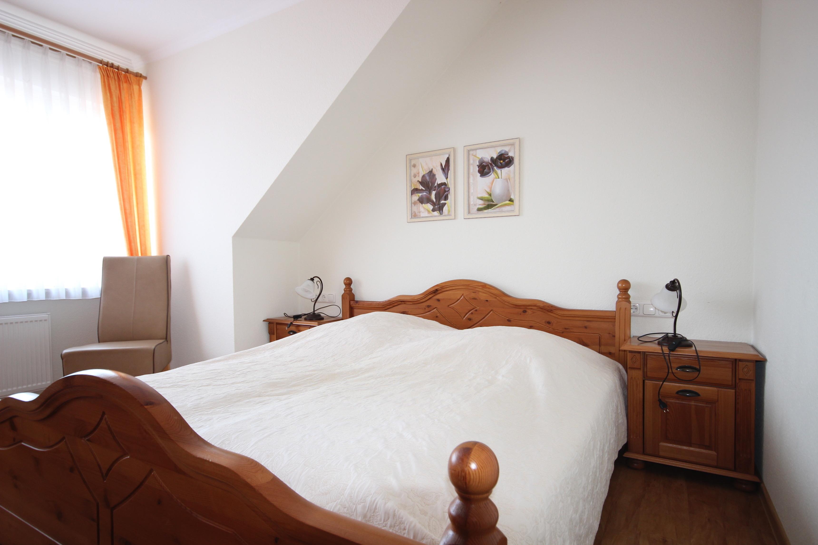 Im Schlafzimmer ist ein komfortables Doppelbett & Kleiderschrank vorhanden.