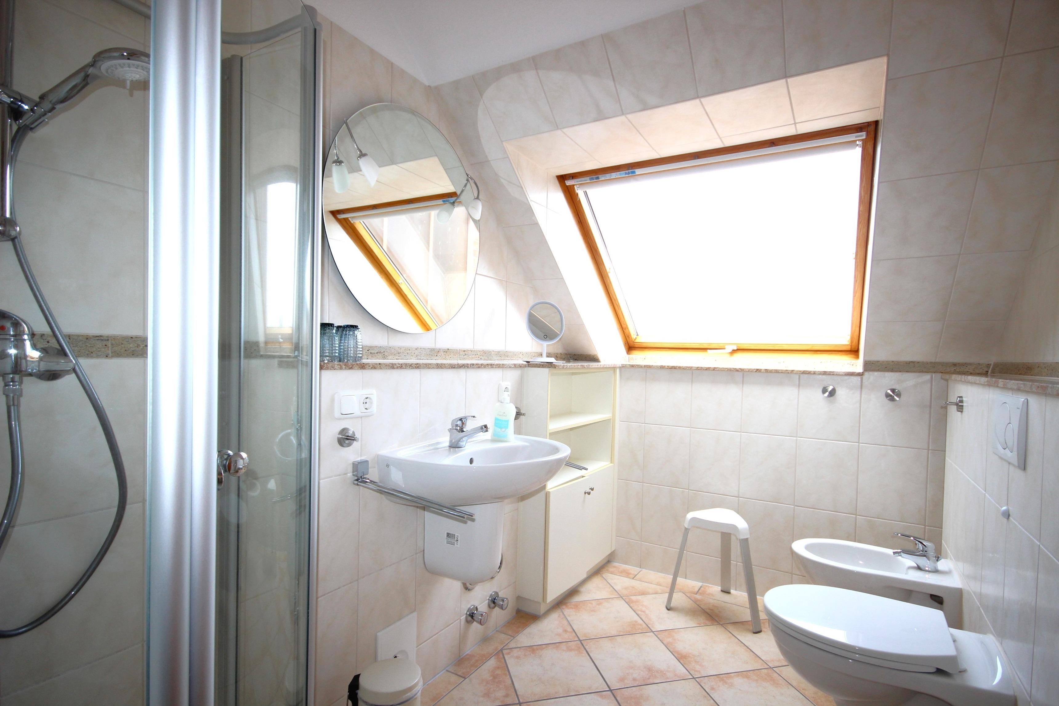 Helles Bad mit großer Dusche, WC, Waschtisch & Bidet.
