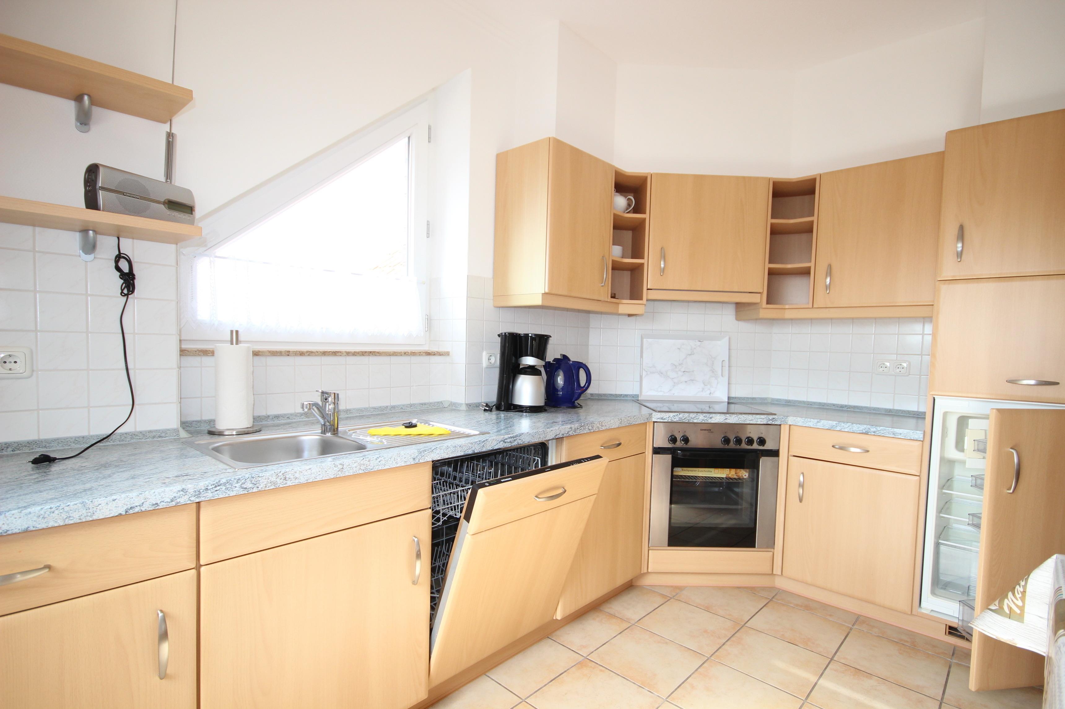 Die Küche ist mit Geschirrspüler, Mikrowelle, Backofen/ Cerankochfeld und Kühlschrank & alle üblichen Küchengeräte sehr gut ausgestattet.