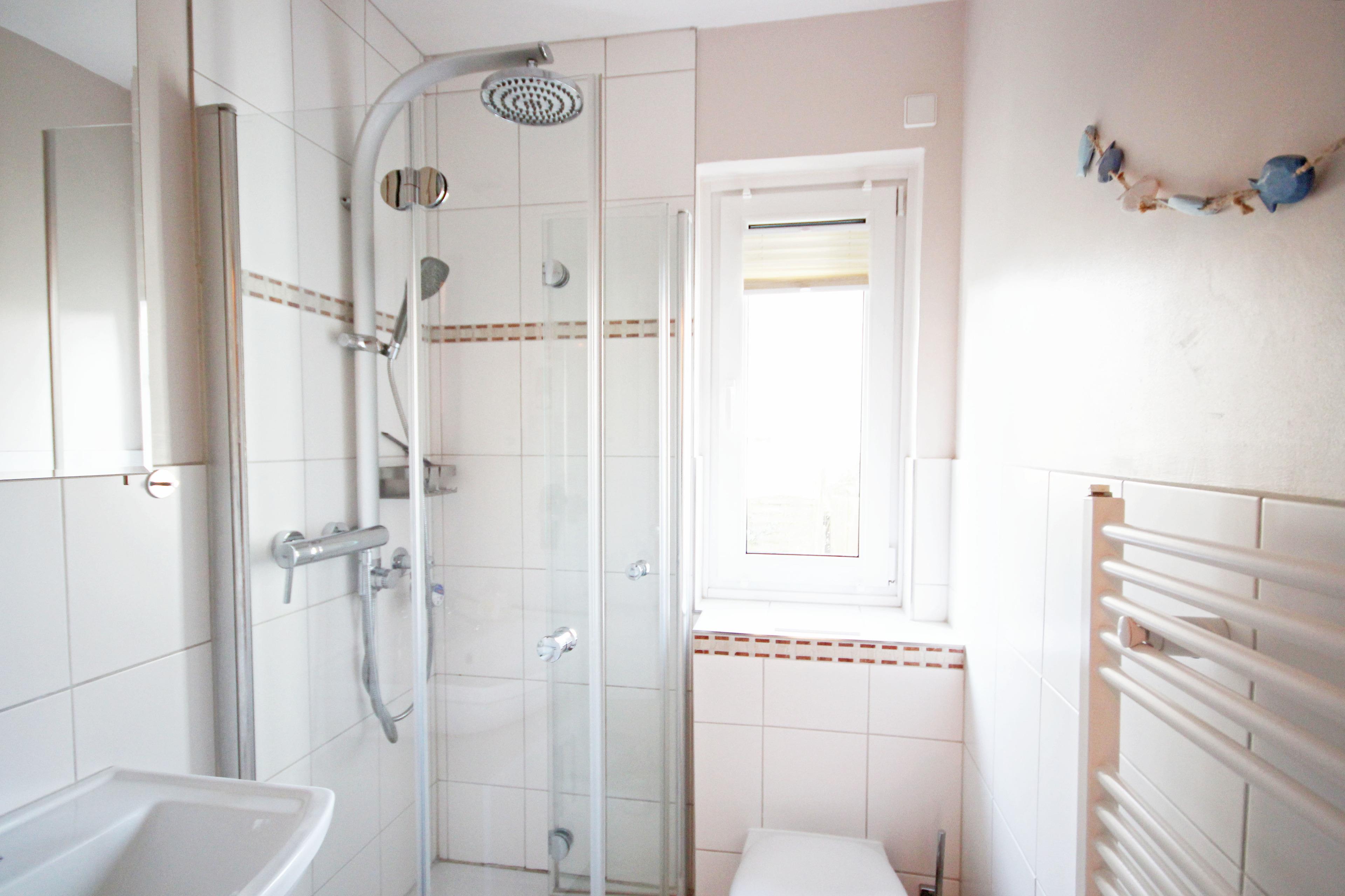 Hell gefliestes Bad mit Glasduschkabine, WC, Waschbecken & Fenster.