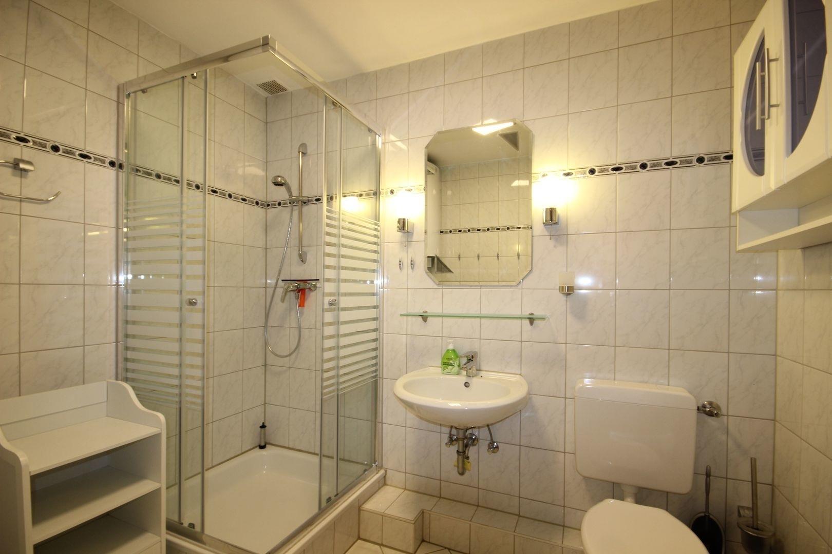 Helles, freundliches Bad mit Dusche/Trennwand, WC & Waschbecken.