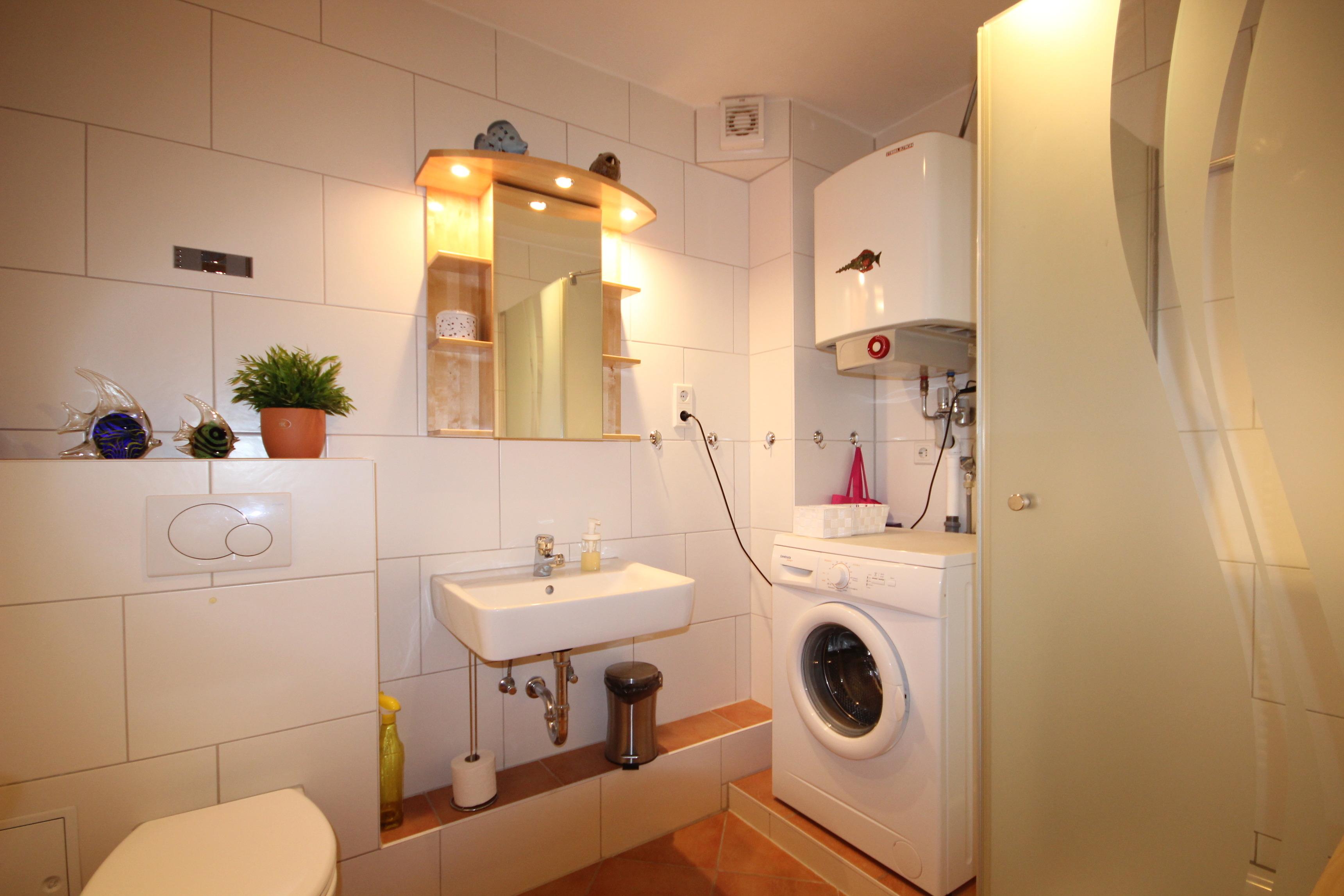 Helles Duschbad mit WC & Waschbecken. Die Waschmaschine steht nicht zur Verfügung.