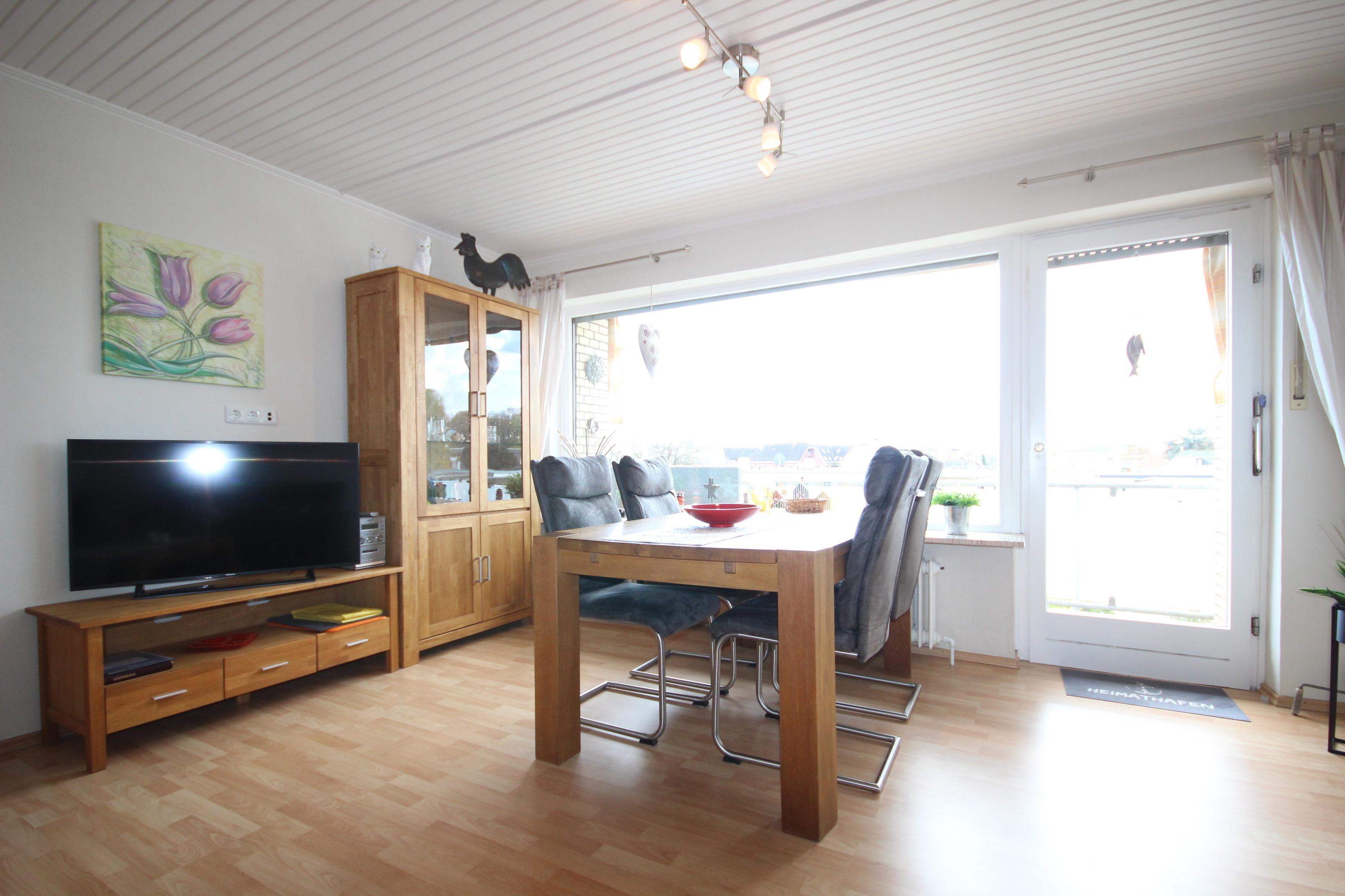 Der großzügige Wohnbereich ist mit einer gemütlichen Sitzecke, Essbereich, Flachbild-TV/Radio/CD geschmackvoll ausgestattet und hat Zugang zum sonnigen Süd-Balkon.