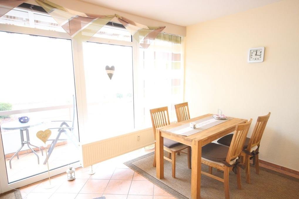 Im hellen, geräumigen Wohnzimmer befindet sich ein Essplatz für 4 Pers., eine bequeme Couchgarnitur (ausziehbar als Schlafplatz für 2 Pers.), TV, Disk-Kompakt-Anlage sowie Zugang zum Süd-Balkon mit Markise. WLAN vorhanden.