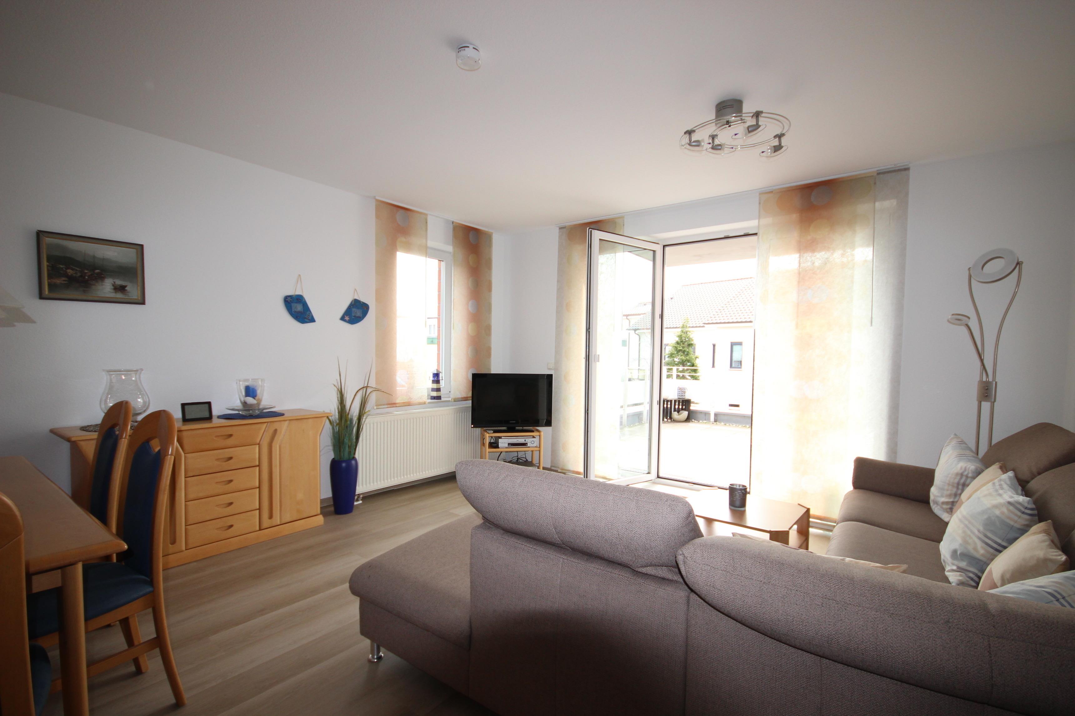 Gemütlicher Wohnbereich mit Couchgarnitur, Esstisch, Kabel-TV, Stereoanlage/CD & sonnigem, großen Südbalkon.
