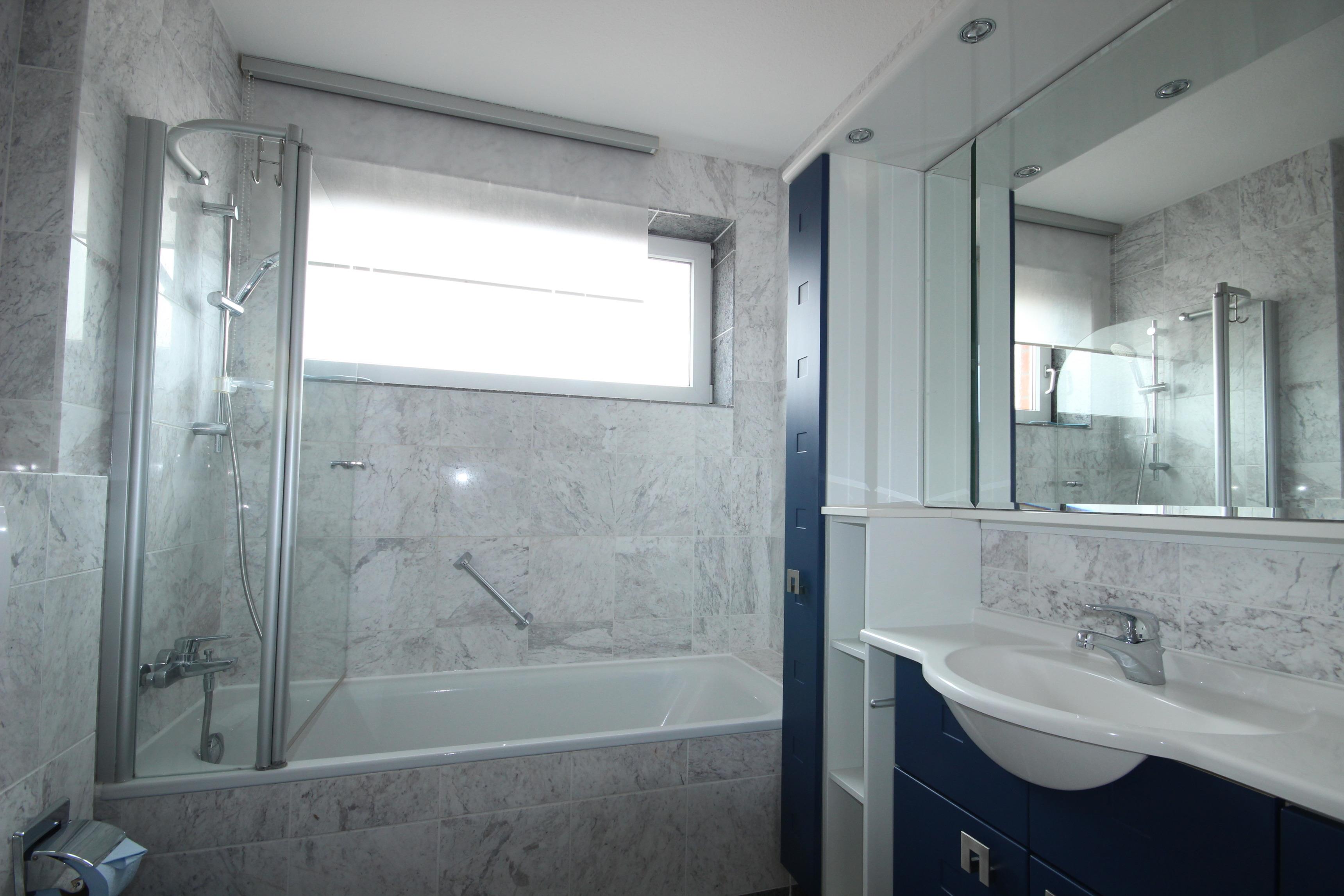 Helles gefliestes Bad mit Badewanne, Waschbecken und WC.