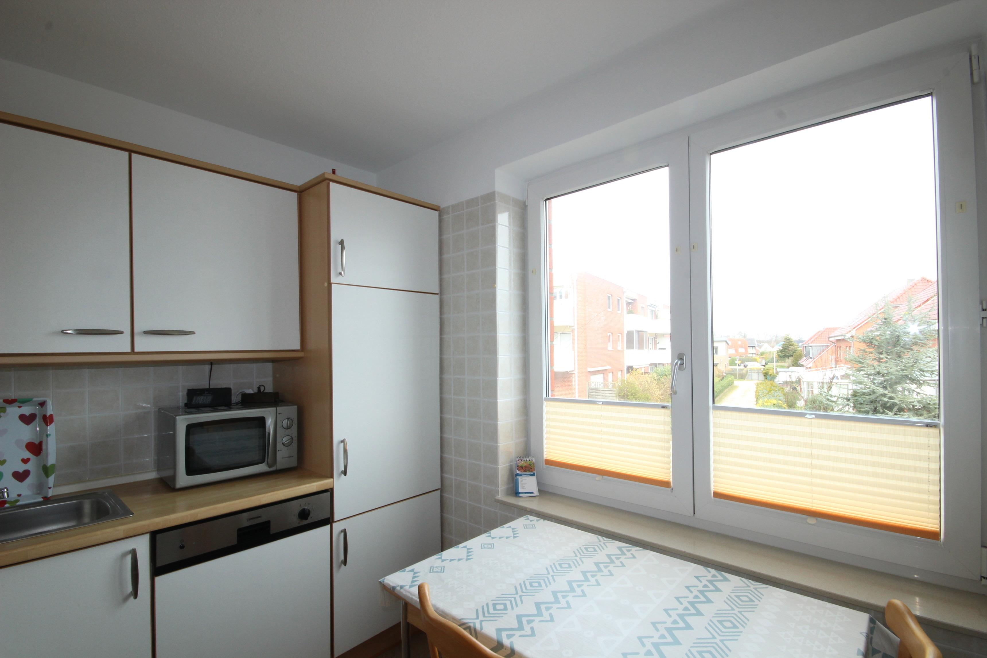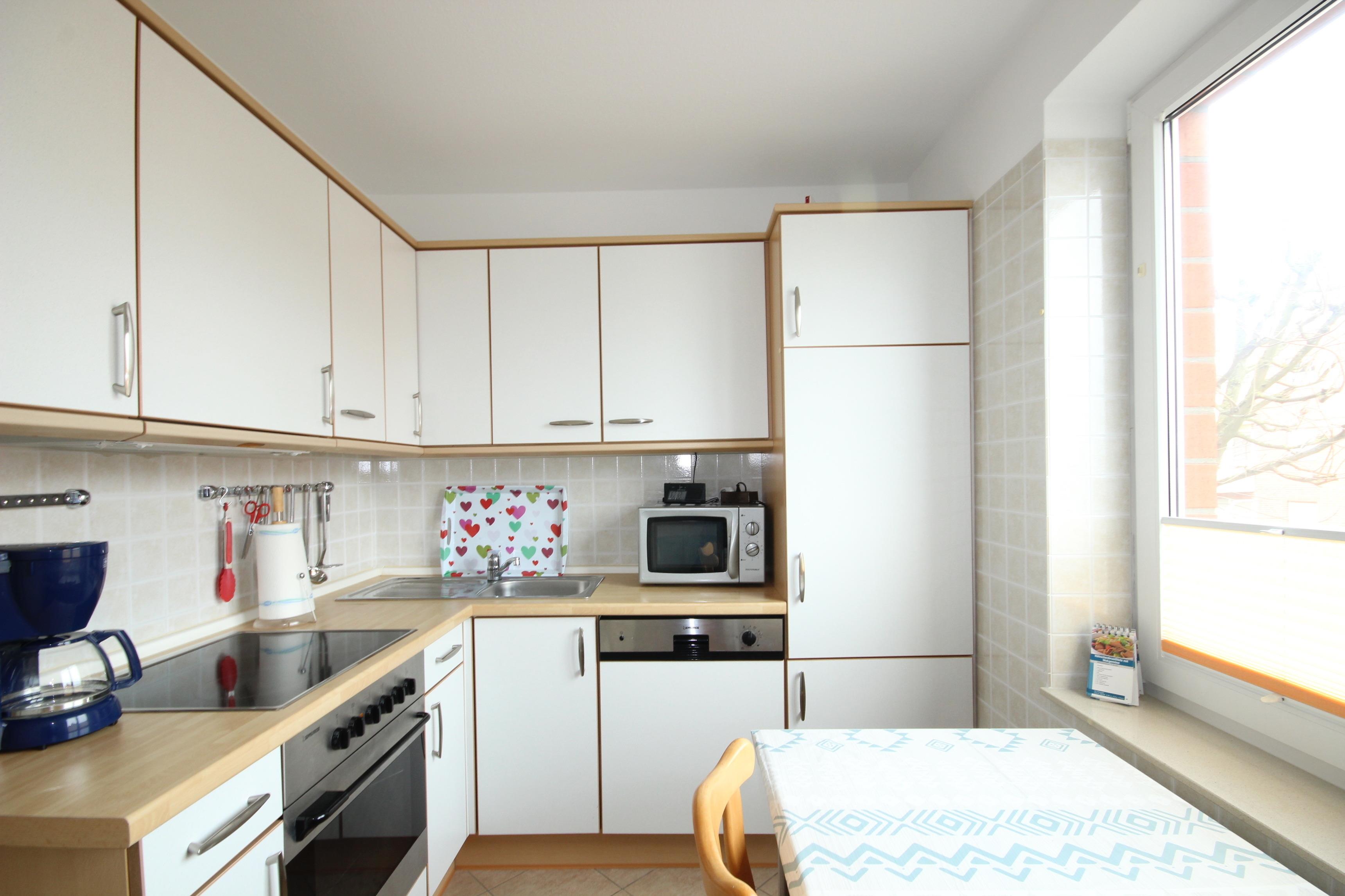 Die Küche verfügt über Cerankochfeld, Backofen, Geschirrspüler, Mikrowelle, Kühlschrank sowie die üblichen technischen Geräte sind vorhanden.