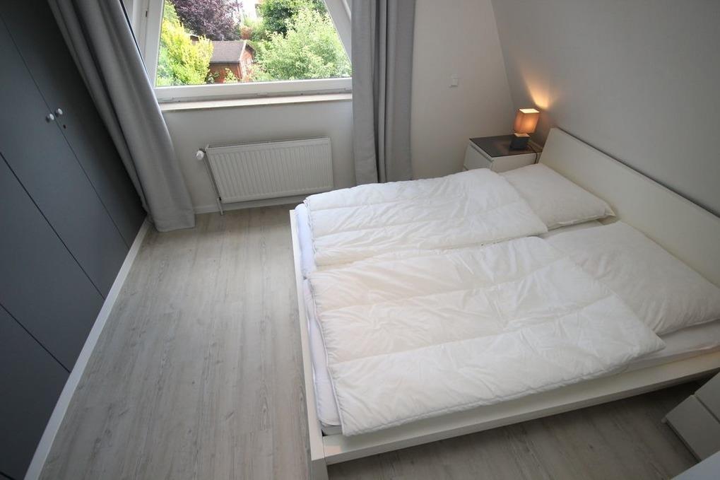 Im OG liegt ein Schlafzimmer mit Ehebett & Kleiderschrank. Ein Kinderreisebett (Hauck) steht bereit.