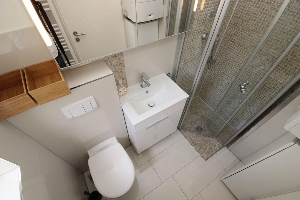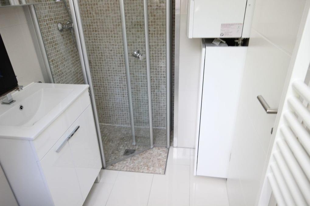Modernes Bad mit bodentiefer Dusche und Handtuchheizkörper im EG.