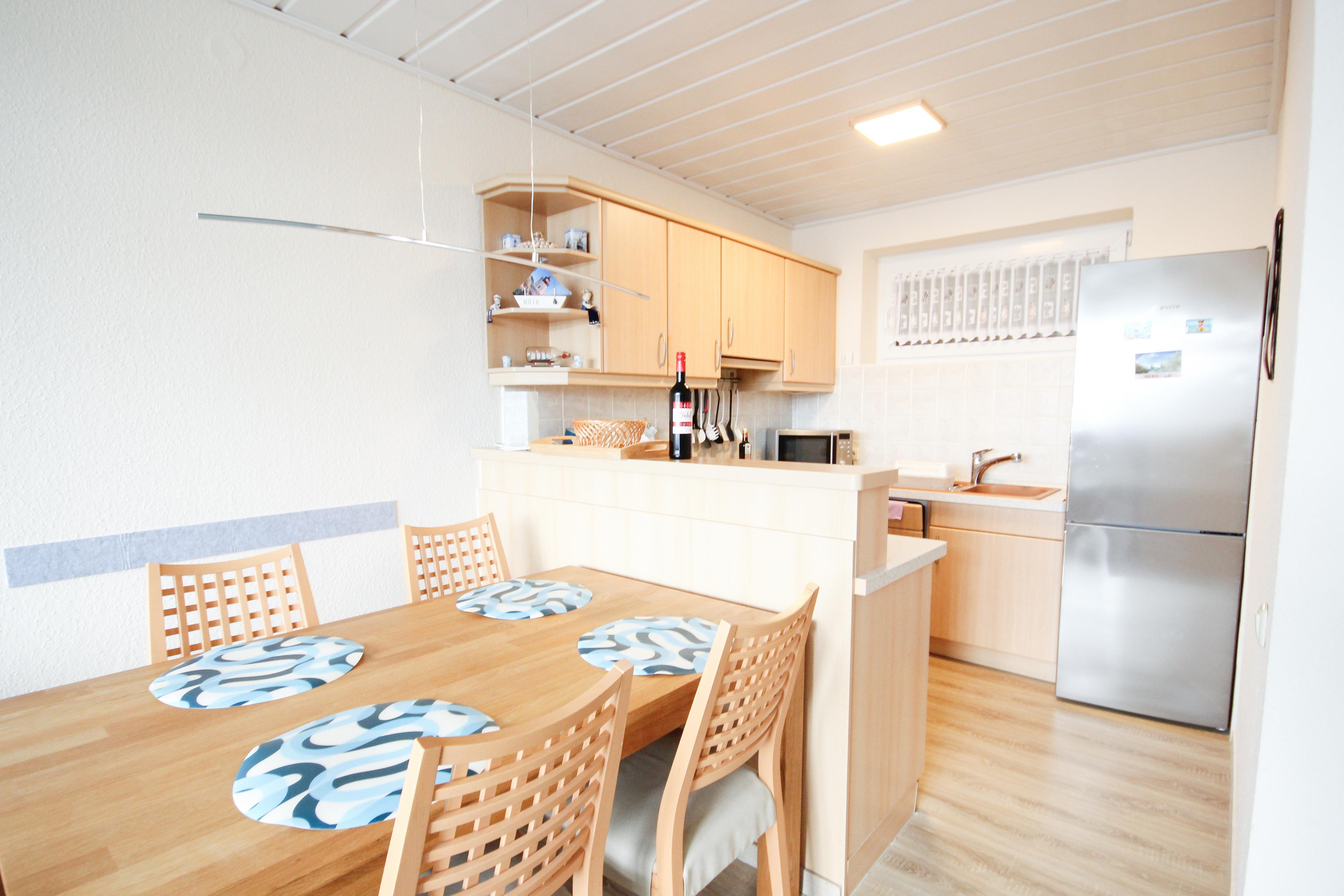Die offene Küche ist sehr gut ausgestattet mit Spülmaschine, Kühlschrank mit Gefrierfach, Herd mit Cerankochfeld, Backofen und separater Mikrowelle sowie allen üblichen Küchengeräten.