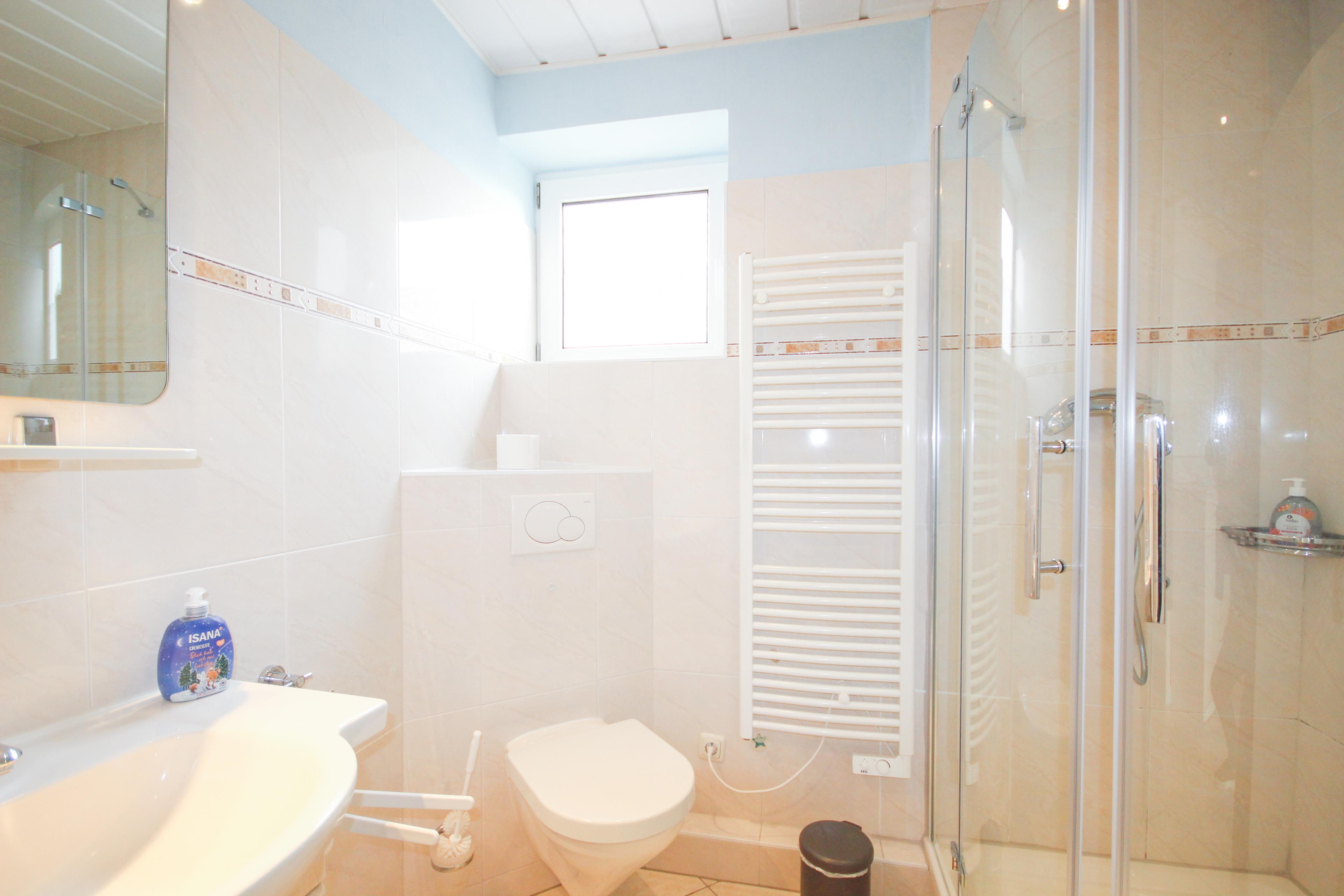 Das helle Tageslicht-Bad ist mit Eckdusche, WC, Waschtisch & Schränken ausgestattet.