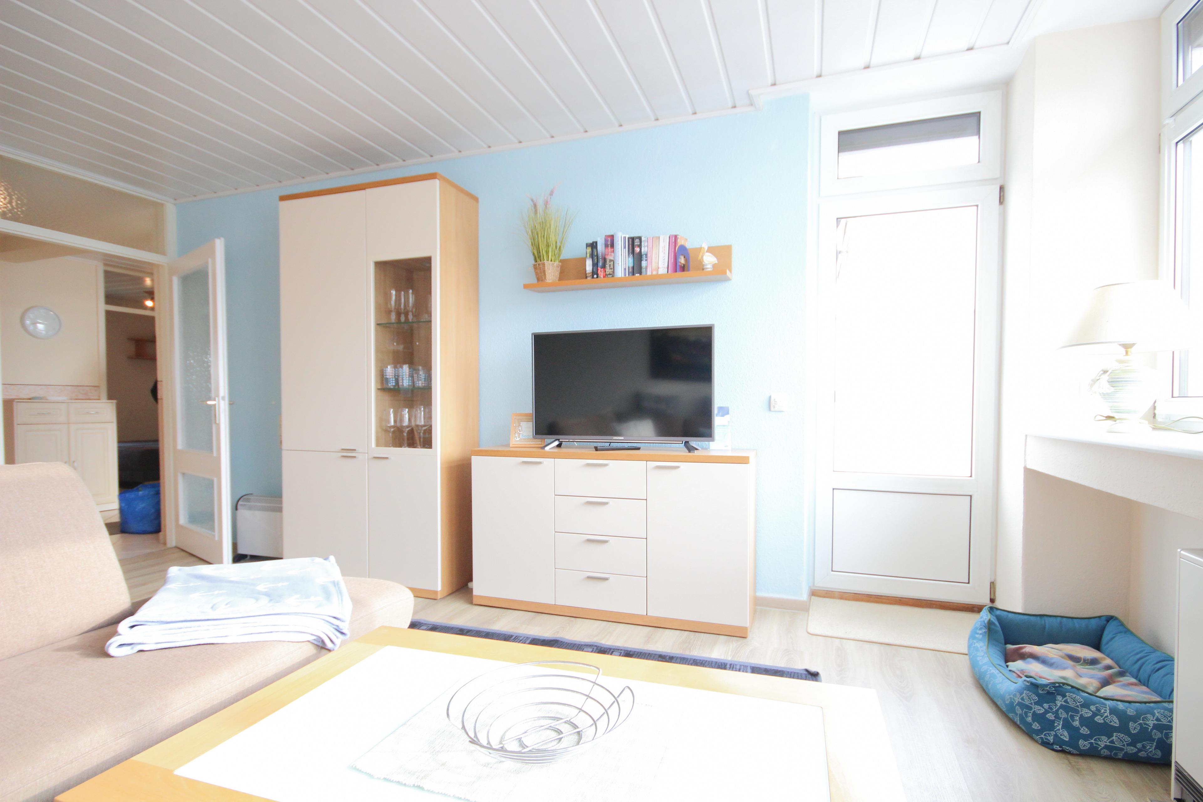 Helles, freundliches Wohnzimmer mit einer gemütlichen Couchgarnitur, Essplatz für 4 Personen, Wohnwand, Flachbild-TV, große Fensterfront und Zugang zum sonnigen Balkon mit Markise.