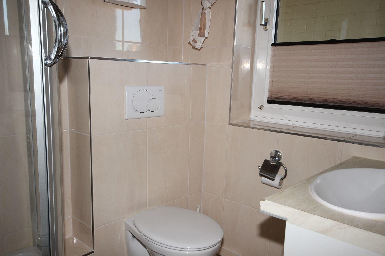 Modern gefliestes Tageslicht-Duschbad mit Rundglasdusche, Waschbecken & WC.