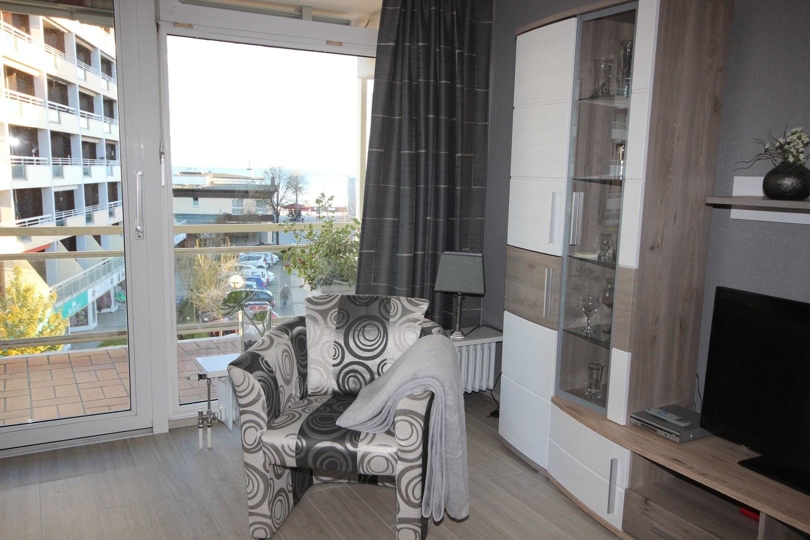 Der gemütliche Wohnbereich hat einen Essplatz und eine stilvolle Couchgarnitur, die zum Bett für 2 Pers. umfunktioniert werden kann, TV, DVD, CD-Radio große, möblierte Loggia mit Markise und Ostseeblick. (ca.50 m²)