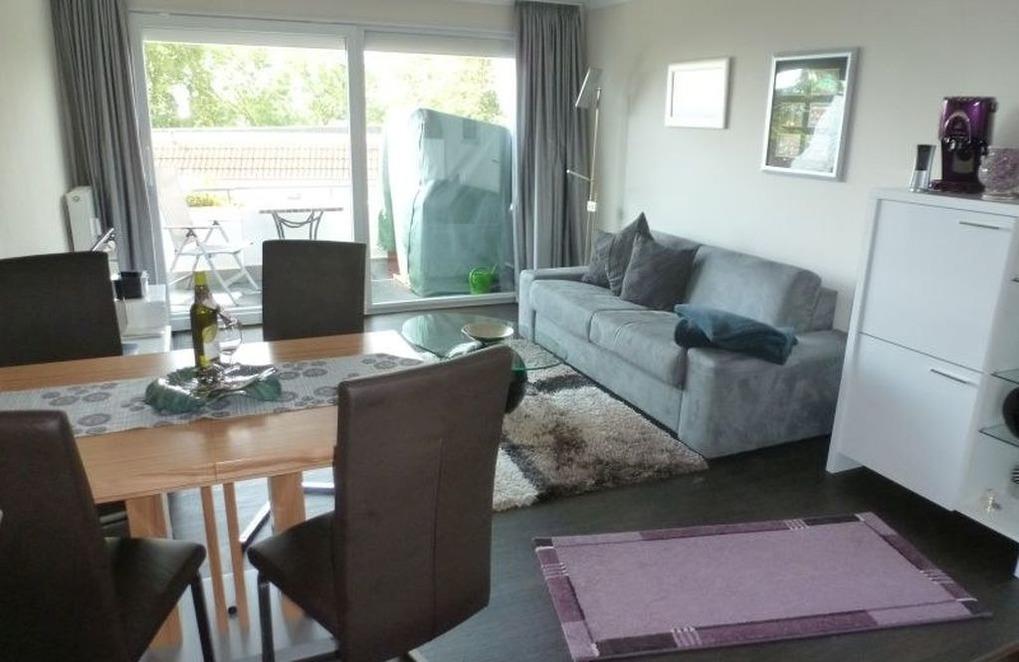 Helles, freundliches Wohnzimmer mit Couch (ausziehbar als Schlafsofa für 2 Pers.), Fernsehsessel, TV, Radio, CD sowie einem schönen Essplatz mit ungehindertem Ostseeblick & Zugang zum möblierten West-Balkon mit Strandkorb & Markise.