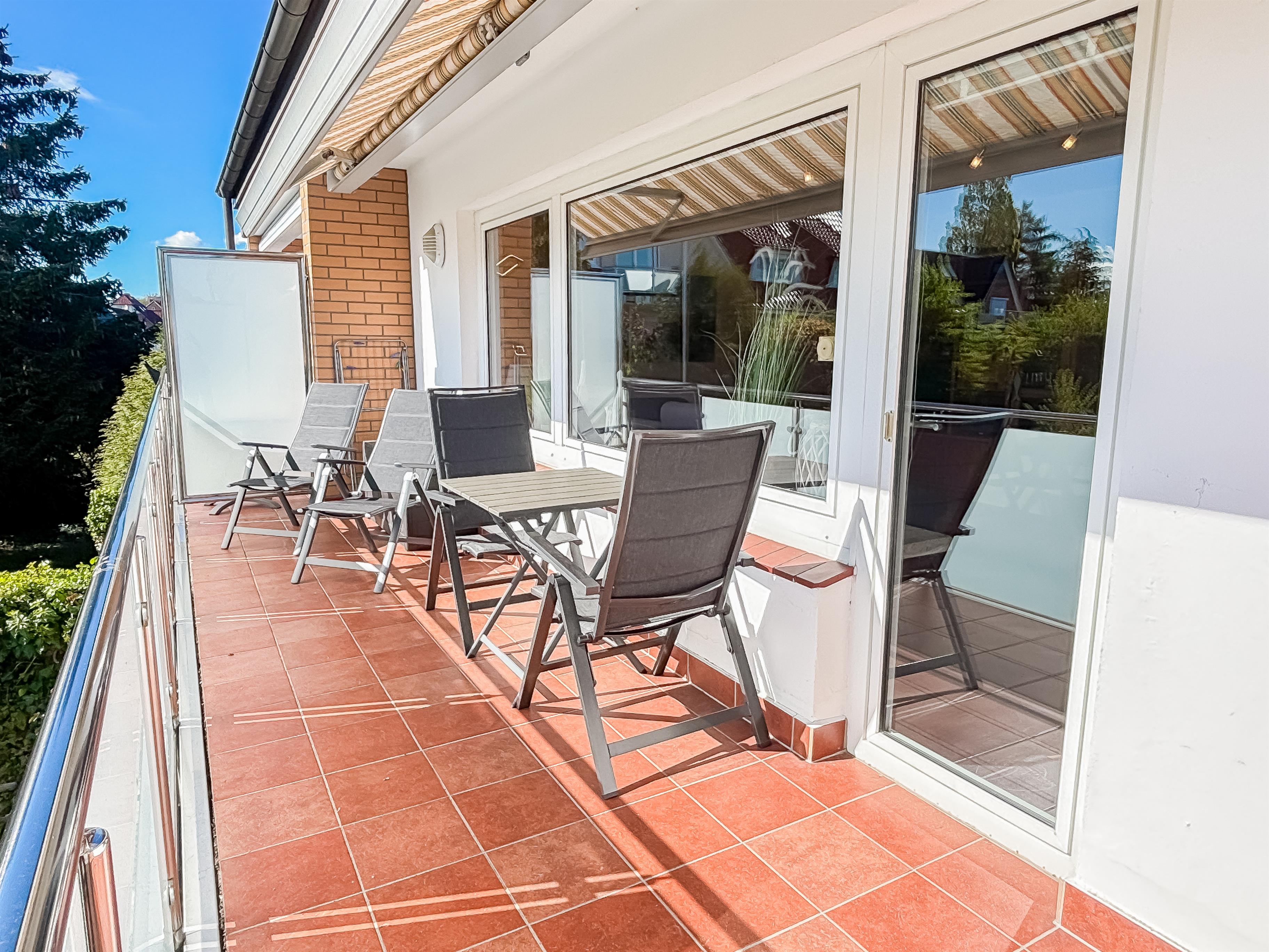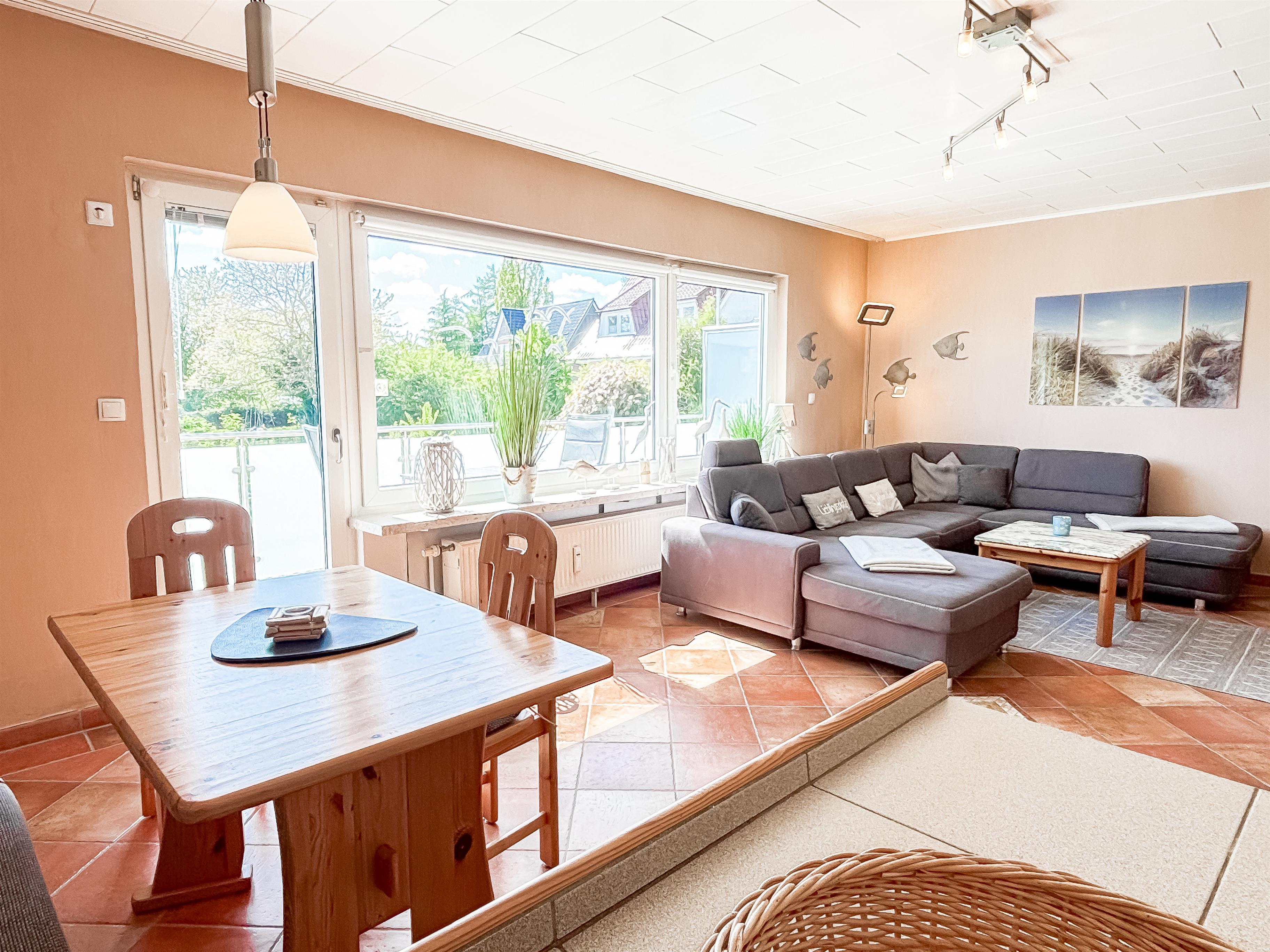 Gemütlicher heller Wohnbereich mit Couchgarnitur, Esstisch, Kabel-TV, Stereoanlage/CD & sonnigem, großen Süd-West-Balkon.