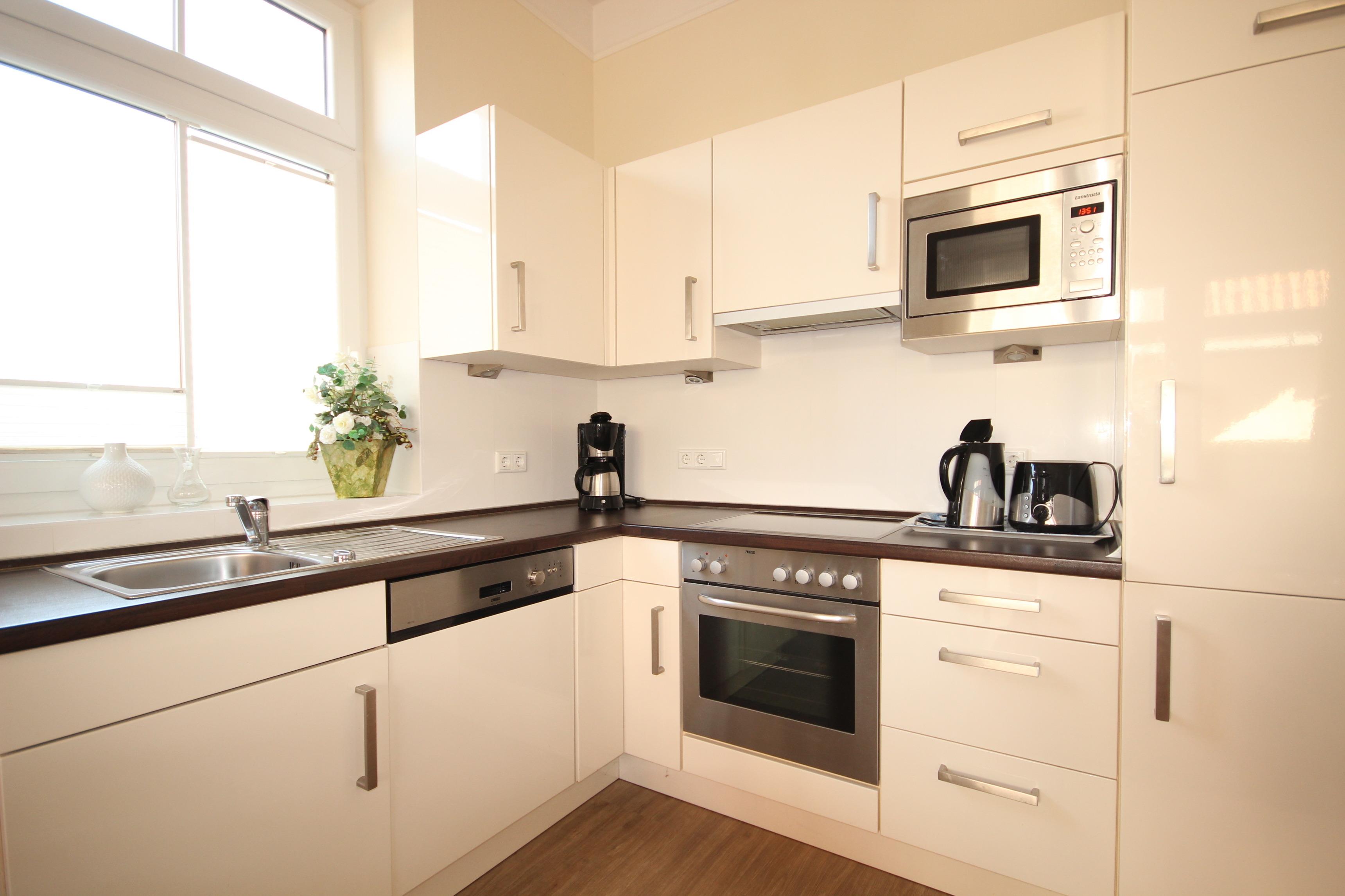 Die offene Küchenzeile ist mit E-Herd-Backofen, Kühlschrank mit Gefrierfach & Geschirrspüler sehr gut ausgestattet.