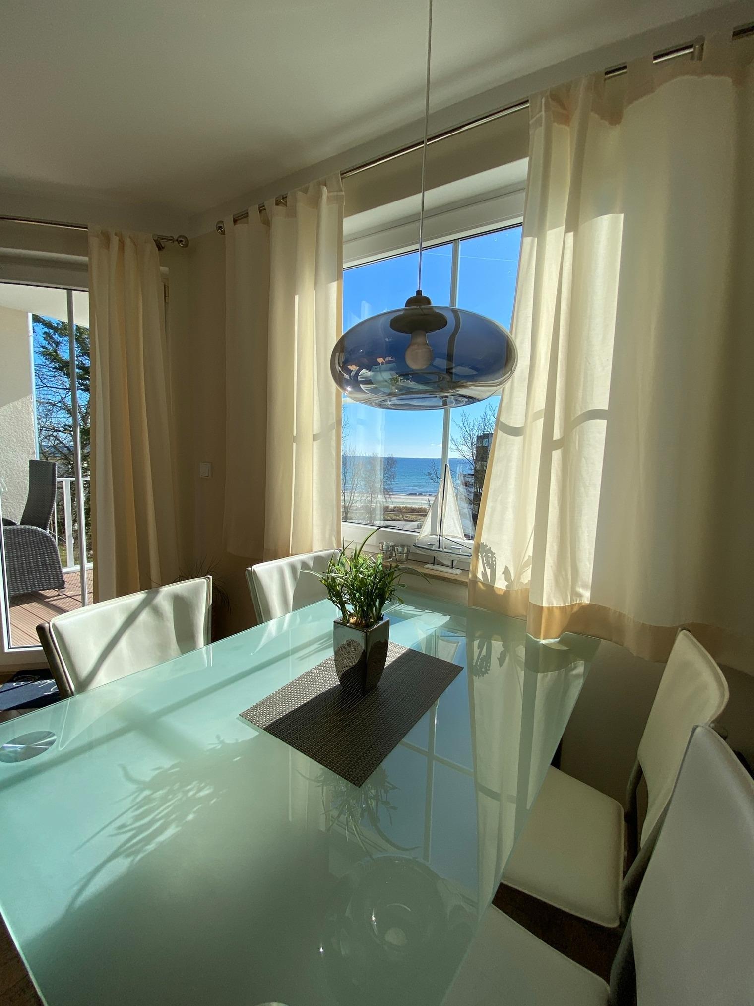 Das gemütliche Wohnzimmer mit Couchgarnitur (ausziehbar als Bett für 2 Personen), TV, Radio und Essplatz für 4 Personen bietet Platz zum Entspannen und Urlaub machen vom 1. Moment.Hier haben Sie auch den Zugang zum Süd-Ostbalkon mit herrlichem Meerblick.