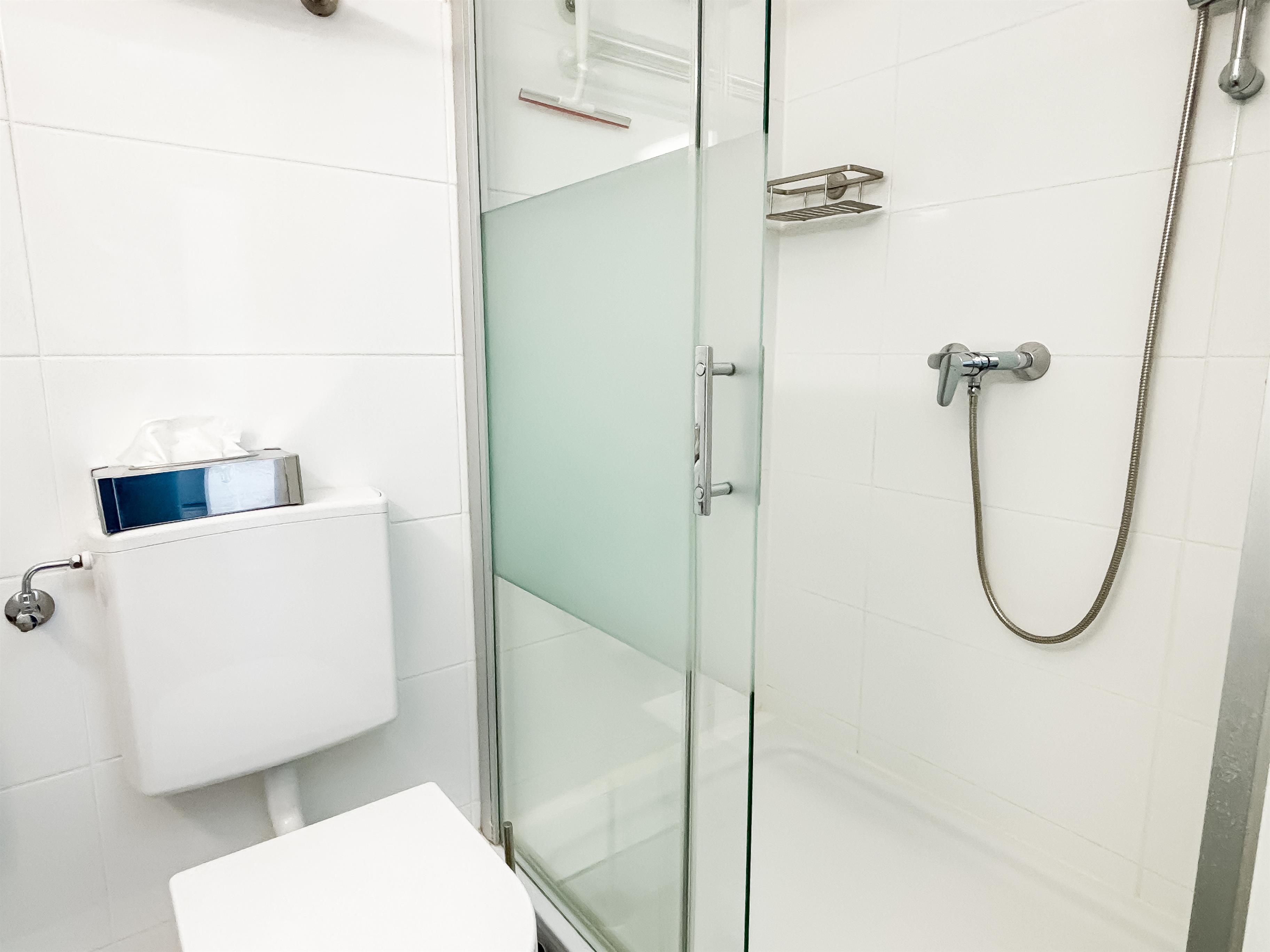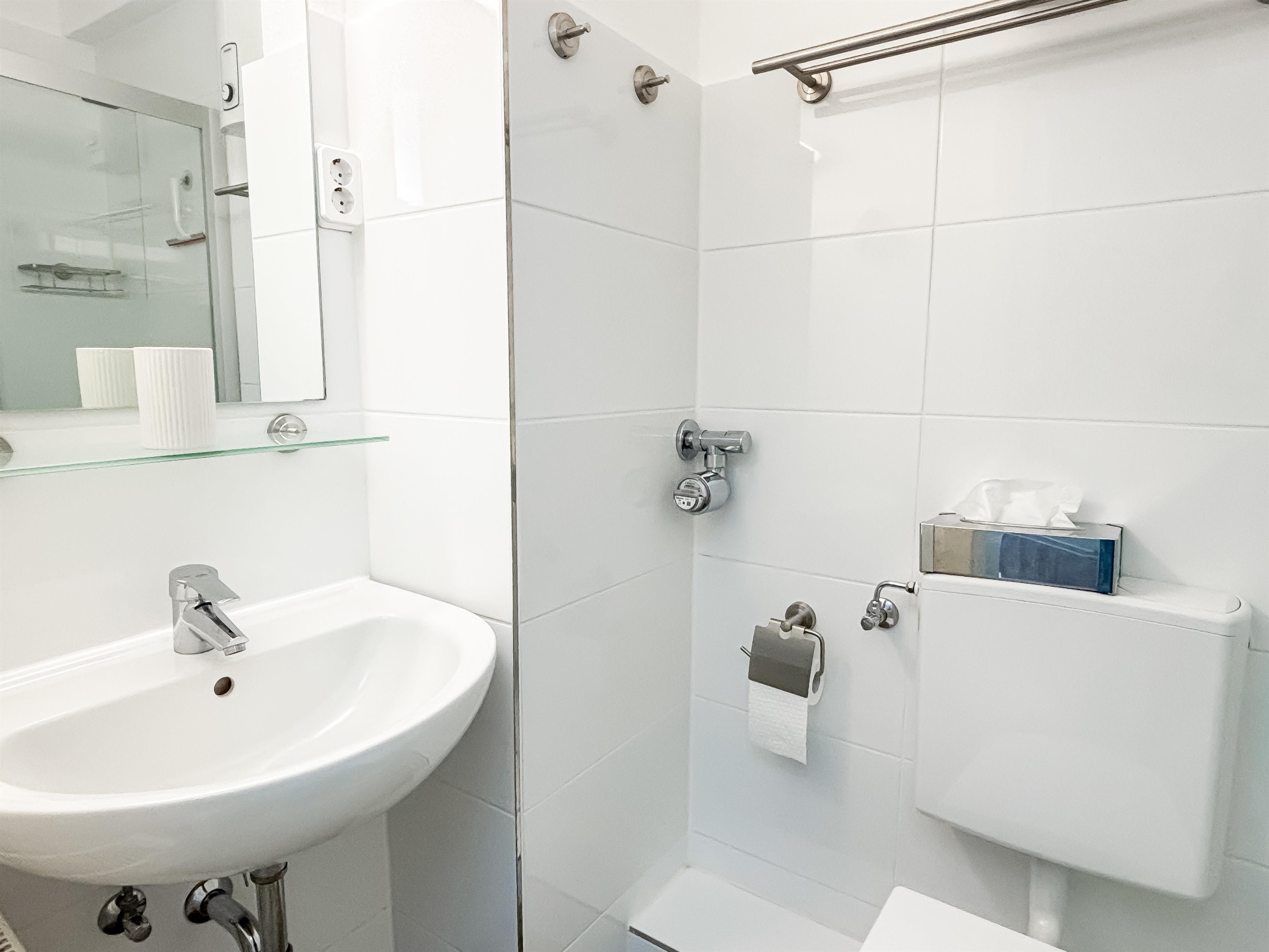 Helles, modernes Bad mit Duschkabine, WC und Waschbecken.