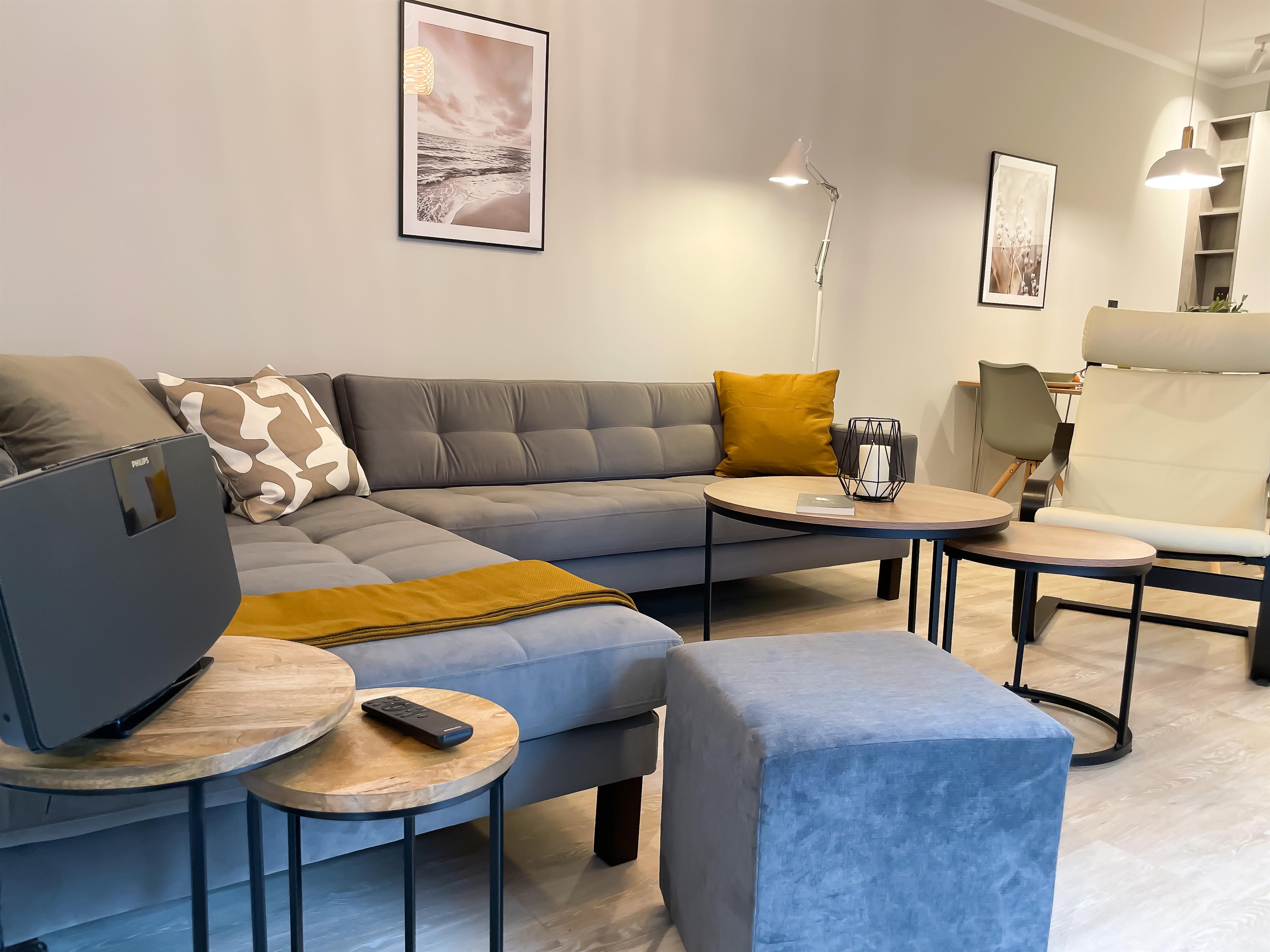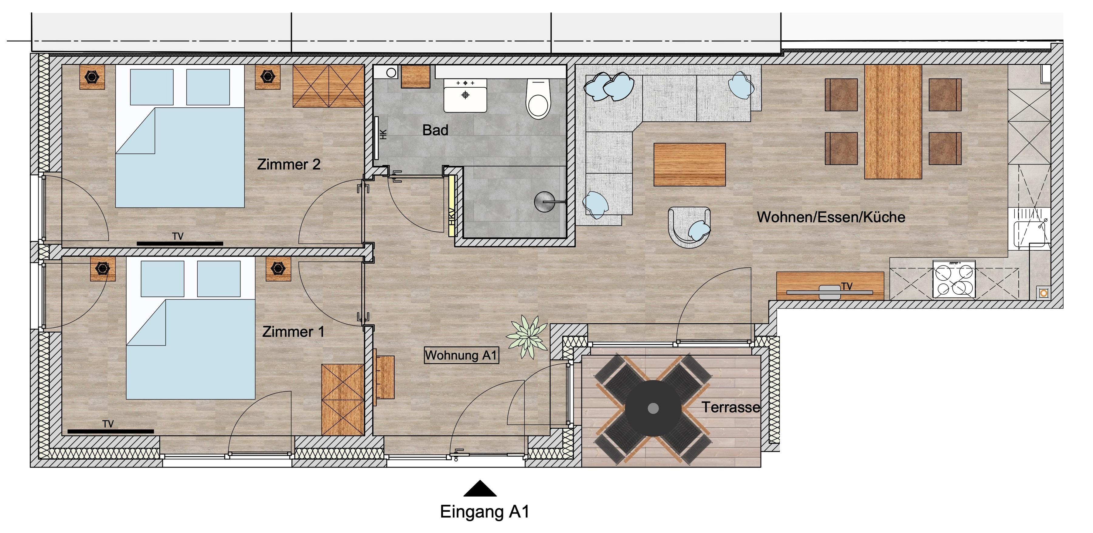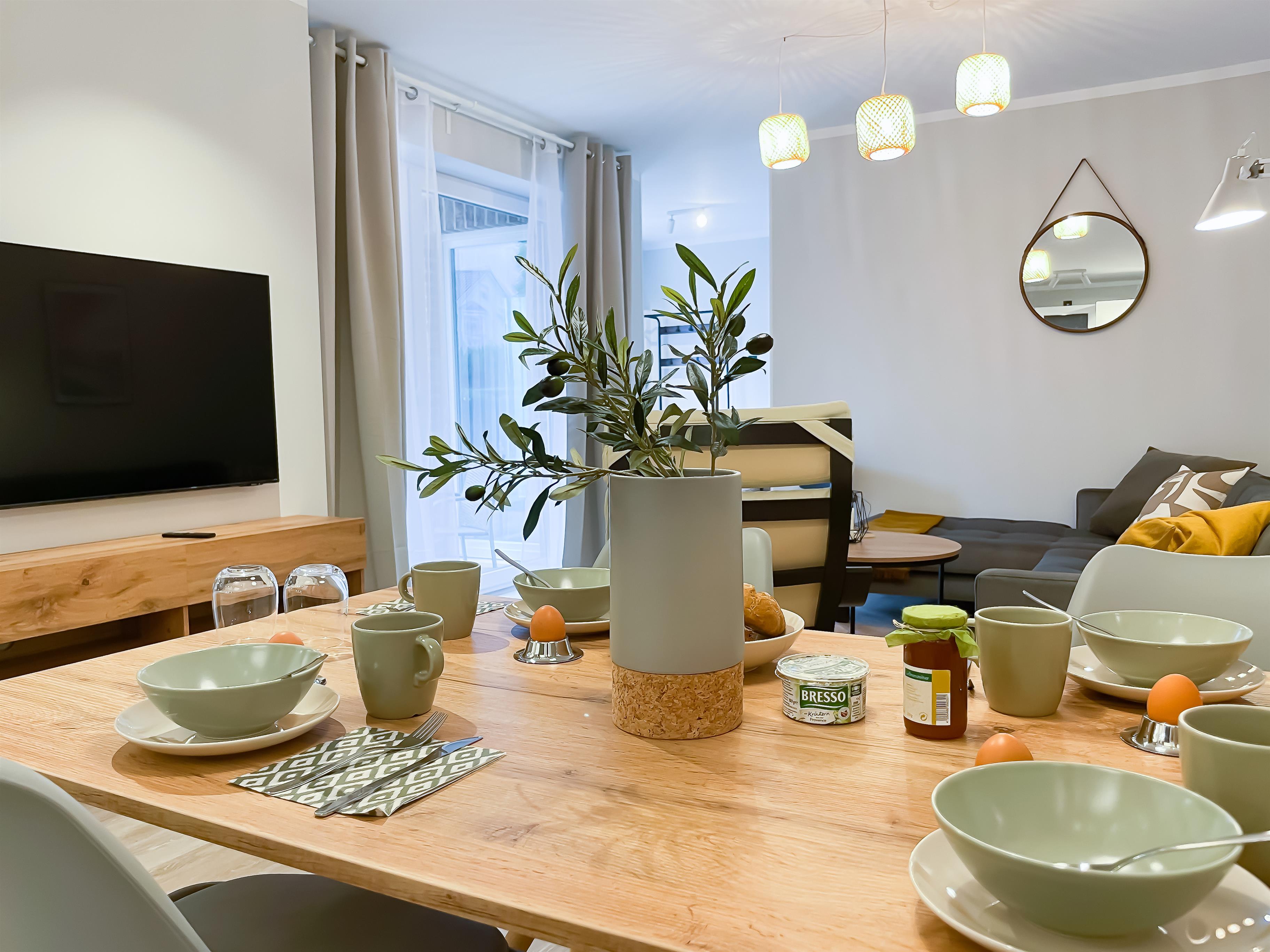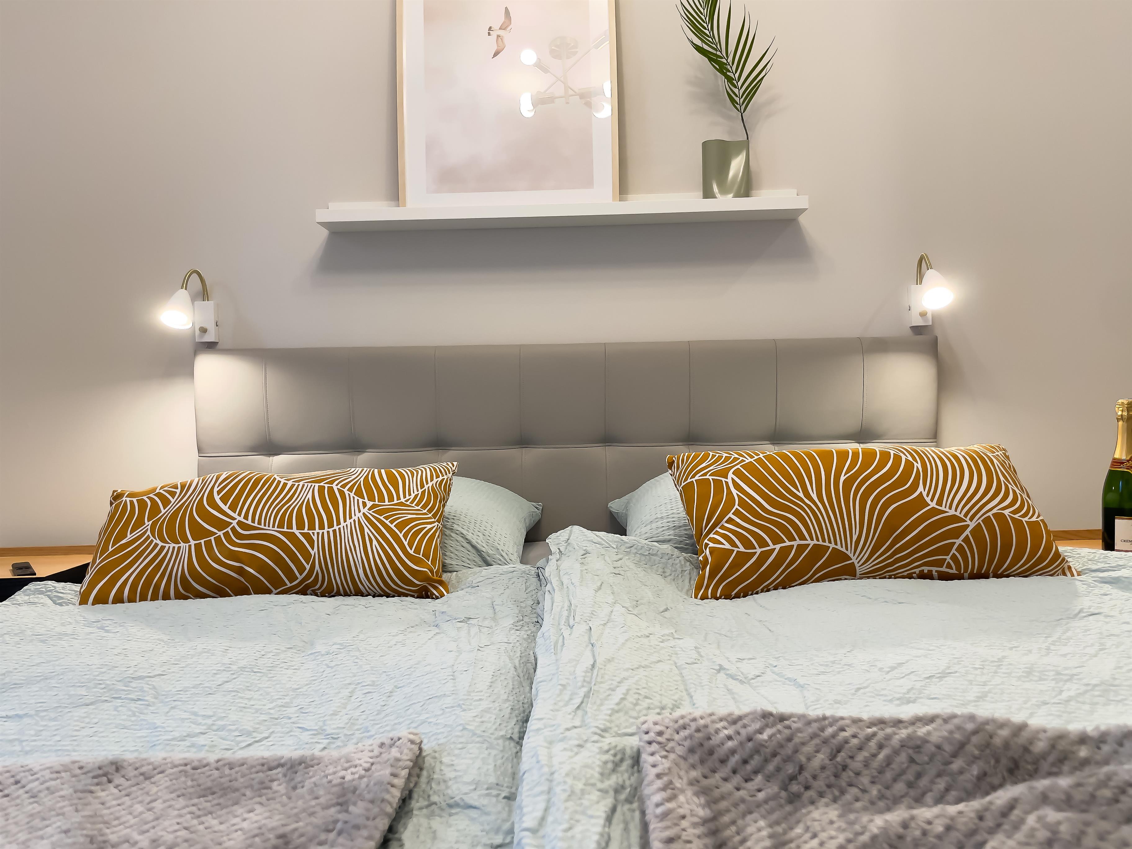 Das Apartment A1 ist überaus umfangreich ausgestattet. Sowohl dem Genießer wie auch dem Technik-Liebhaber wird es an nichts fehlen. Durchweg moderne Einrichtung, Schlafkomfort durch hochwertige Boxspringbetten in Hotelqualität und UHD Smart-TV, Musikanlage sowie High-Speed WLAN sind inklusive.