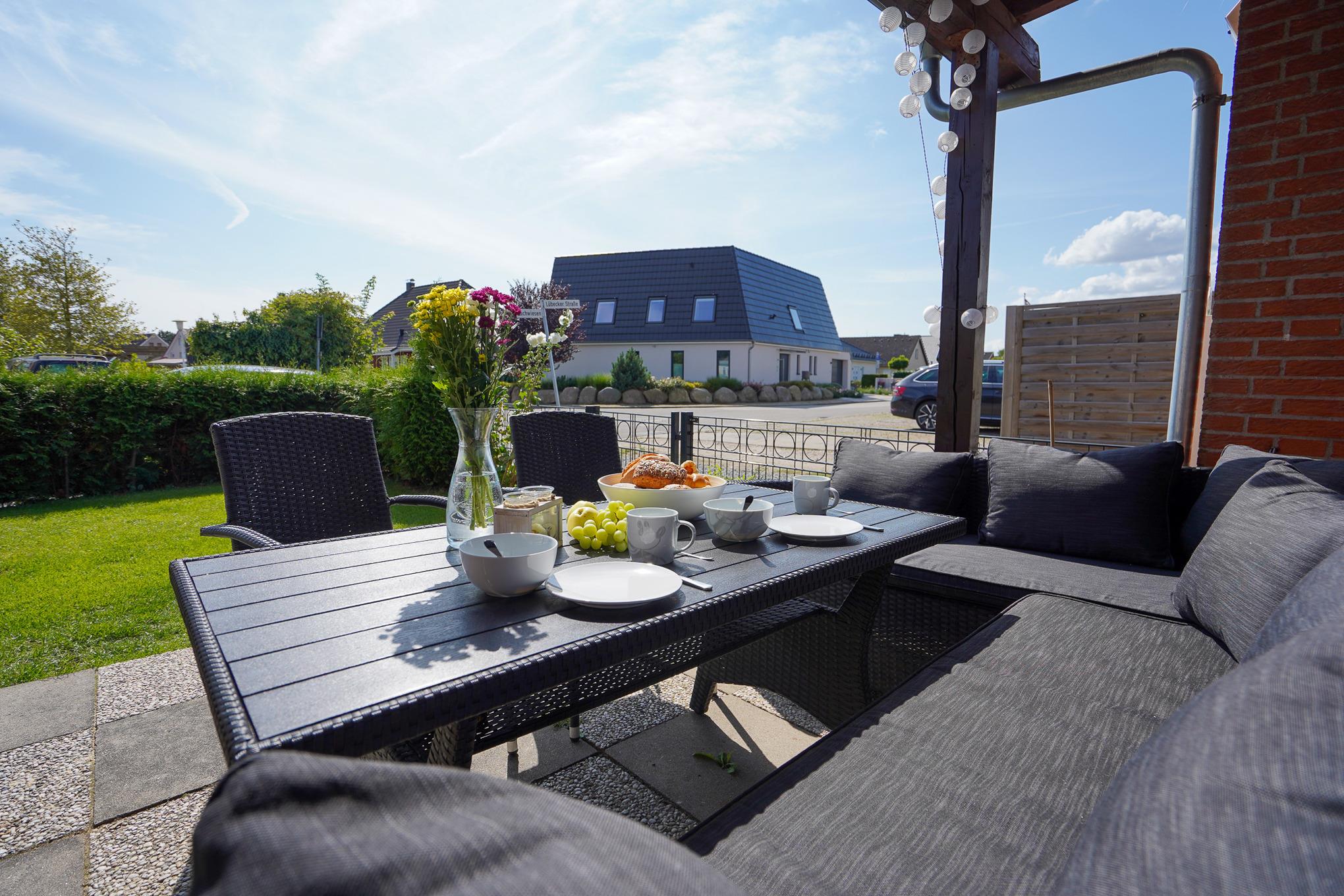 Vom Wohnzimmer gelangen Sie direkt auf die mit einer großen Lounge-Ecke ausgestattete und überdachte Terrasse. Eine kleine eingezäunte Rasenfläche rundet diesen Bereich ab. Hier können sie nahezu den ganzen Tag die Sonne genießen.