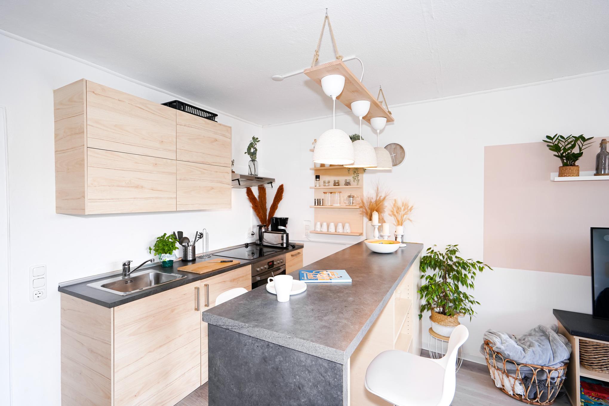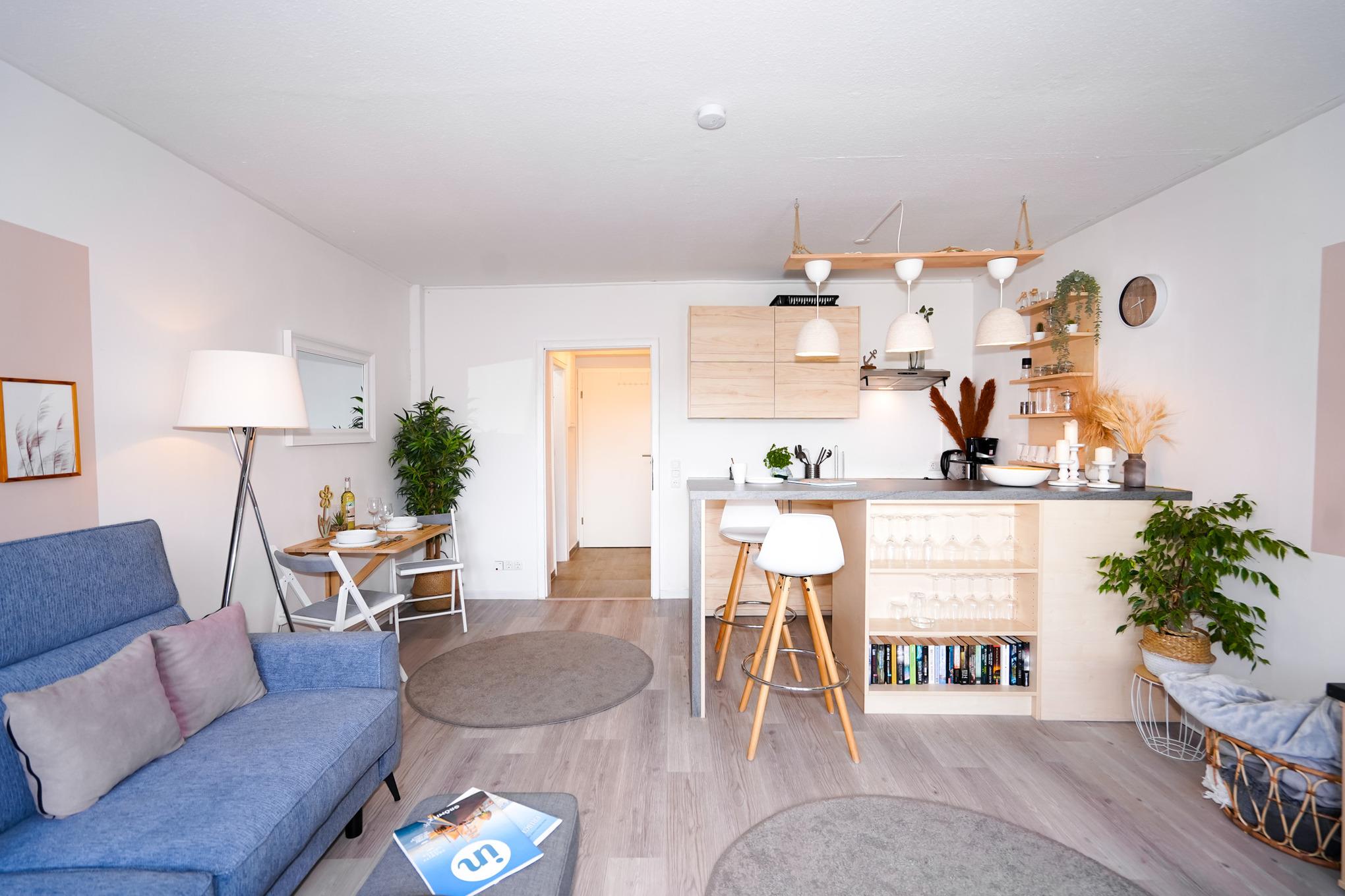 Diese Wohnung wurde vollständig modernisiert und erstrahlt in angenehm warmen Pastelltönen mit neuen Möbeln und Fußböden aus Vinyl. Die Küche und das Badezimmer sind ebenfalls komplett erneuert. Das Wohn/-Schlafzimmer ist mit einem hochwertigen Schlafsofa (140 cm x 200 cm) aus 2025, einem Lowboard, Beistelltischen und diversen Wohnaccessoirs ausgestattet, die den Raum sehr gemütlich wirken lassen.