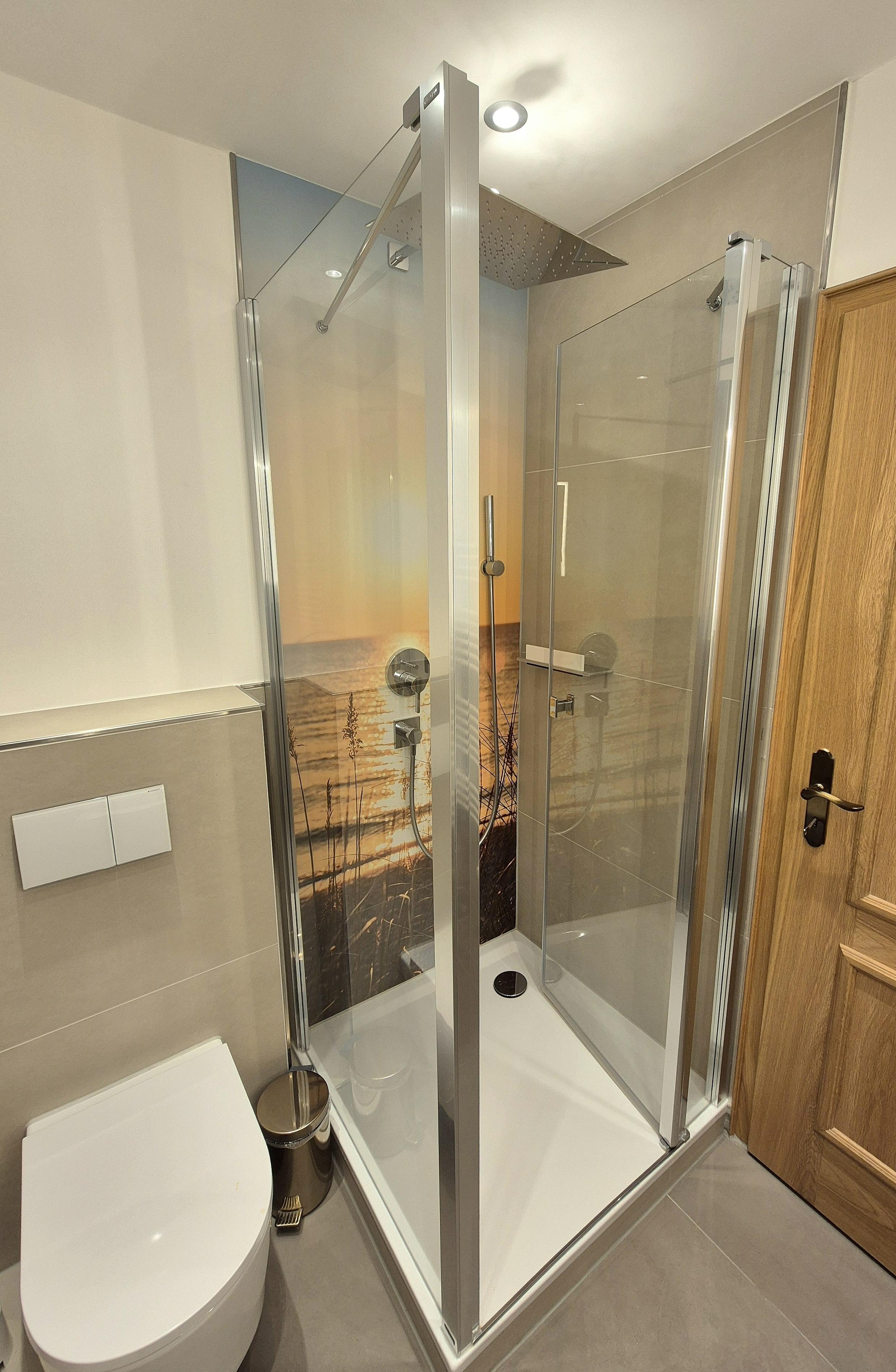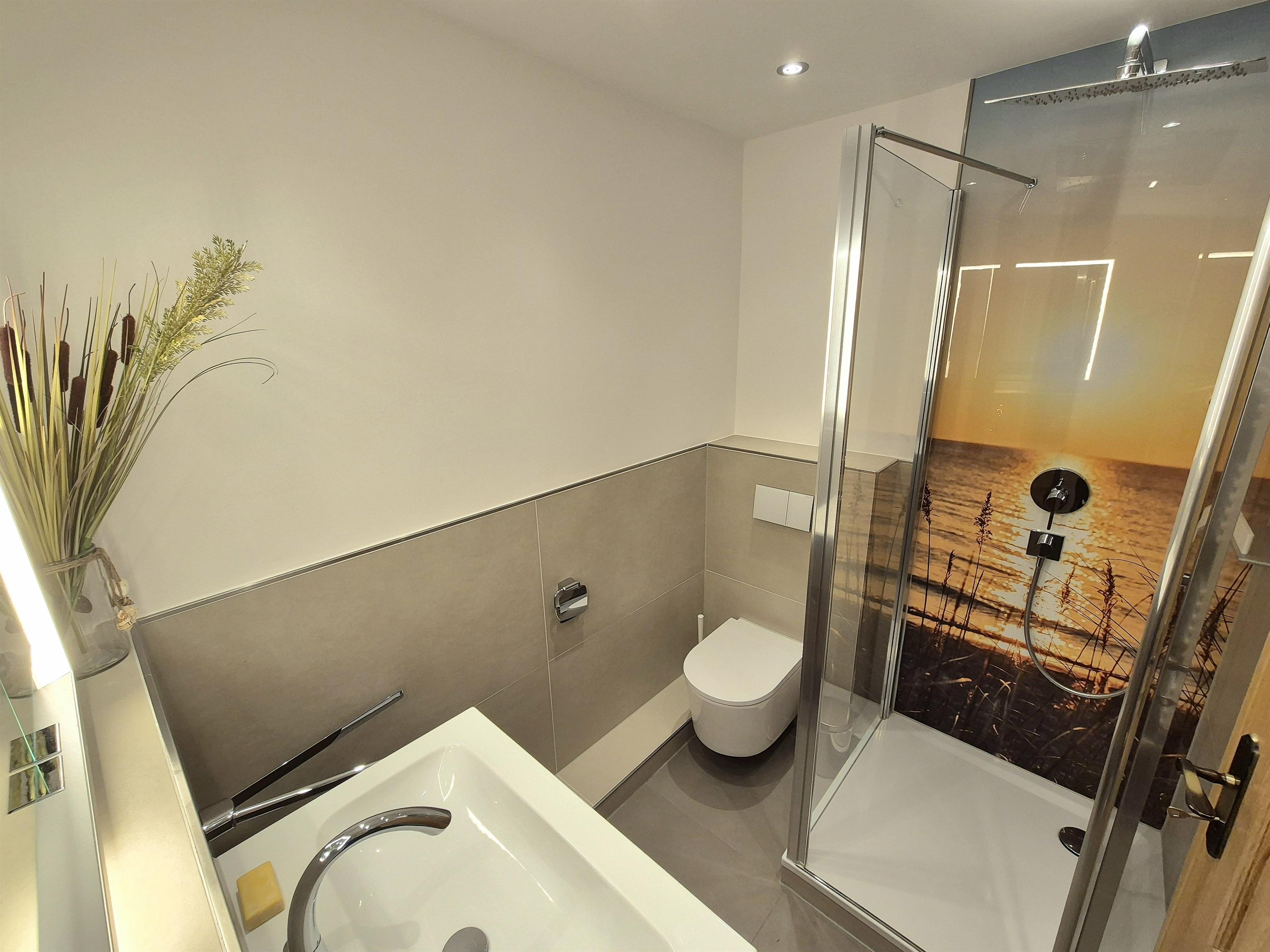 Das Schlafzimmer verfügt über ein Doppelbett mit getrennten Matratzen (180x200 cm) und reichlich Stauraum in Einbauschränken. Ansprechendes modernes Bad mit Dusche und WC.