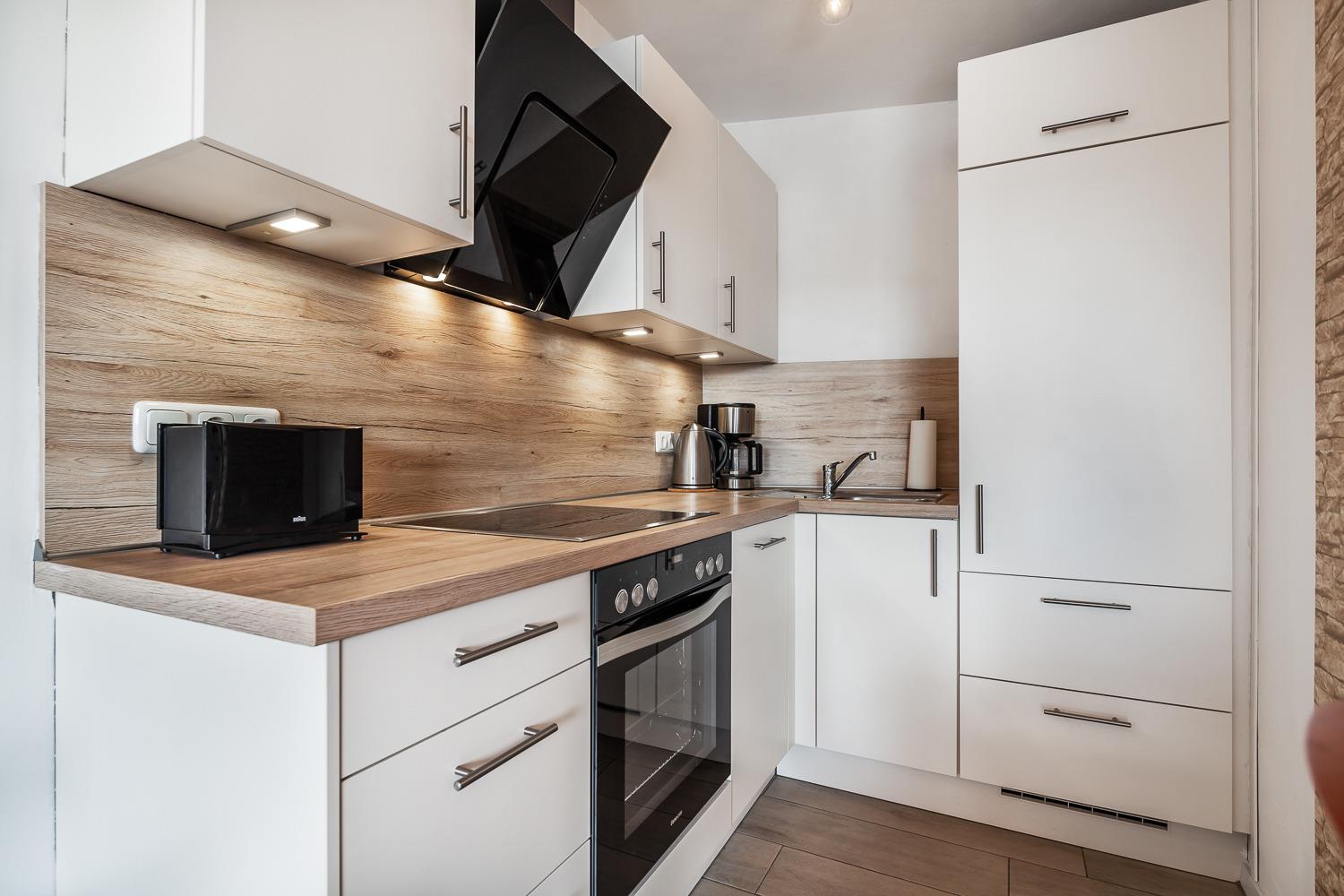 Die neue halb offen gestaltete Küche ist voll ausgestattet und bietet unter anderem ein Cerankochfeld, Backofen, Kühlschrank mit Gefrierfach und weitere kleine Küchenhelfer wie Kaffeemaschine, Wasserkocher und Toaster.
