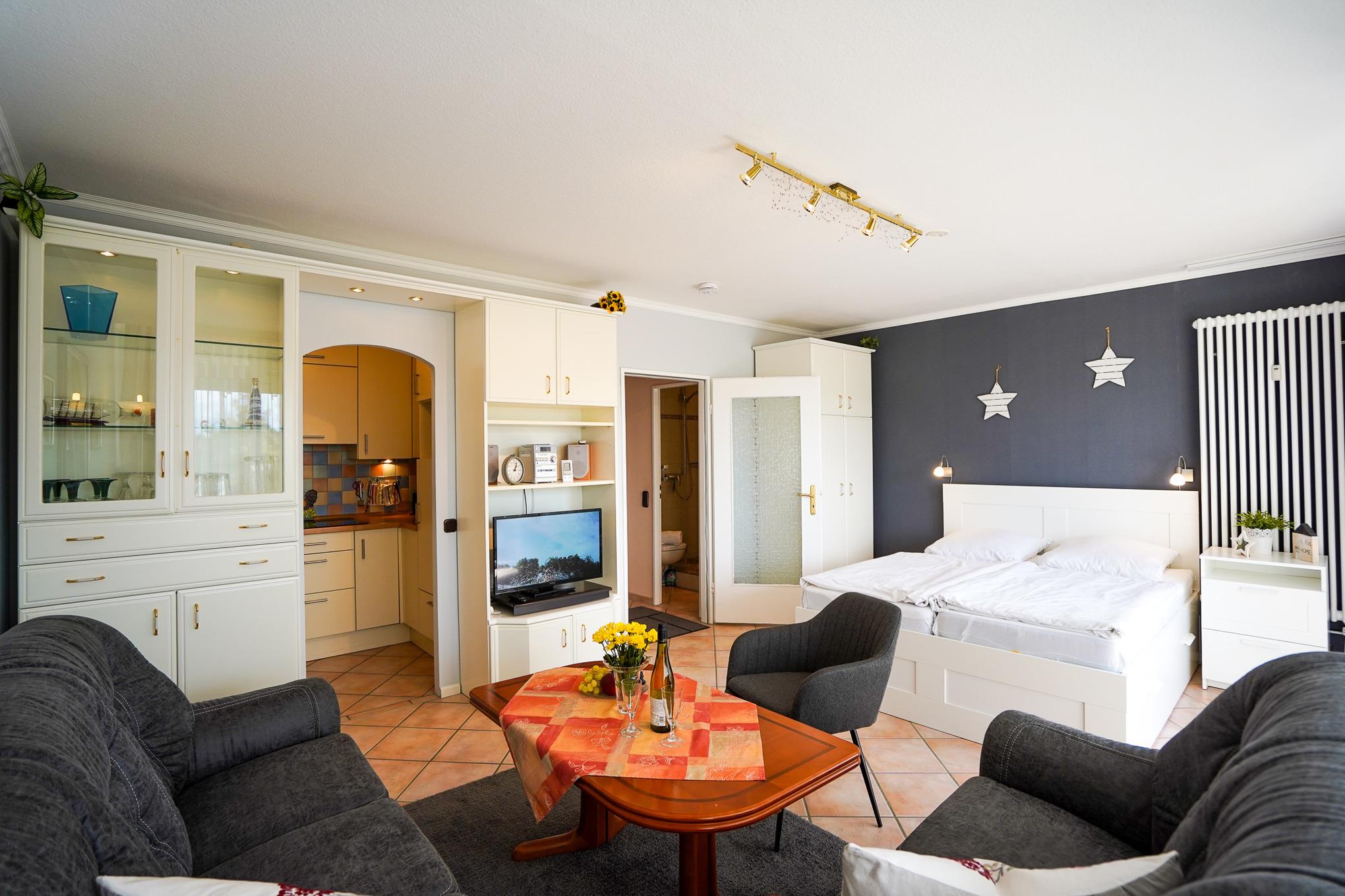 Ein sehr geschmackvoll eingerichtetes Wohnzimmer mit einem bequemen Bett, eine Sofa-Sitzgruppe, eine kleine Küche mit Geschirrspüler, ein Badezimmer mit Dusche und ein großer Balkon mit Blick auf die Ostsee erwarten Sie hier!