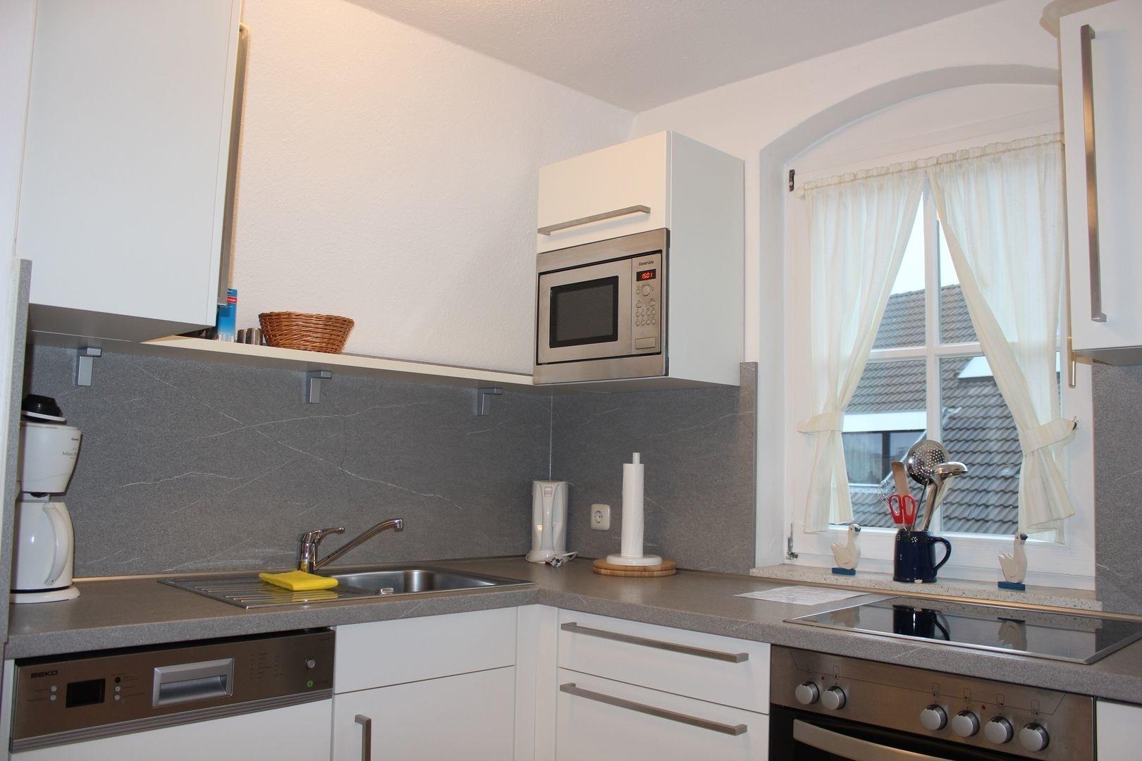 Die Küche ist mit allen wichtigen Küchengeräten wie Geschirrspüler, Kühlschrank, Mikrowelle, Kaffeemaschine, Wasserkocher, Toaster, Backofen und 4-Plattenherd gut ausgestattet