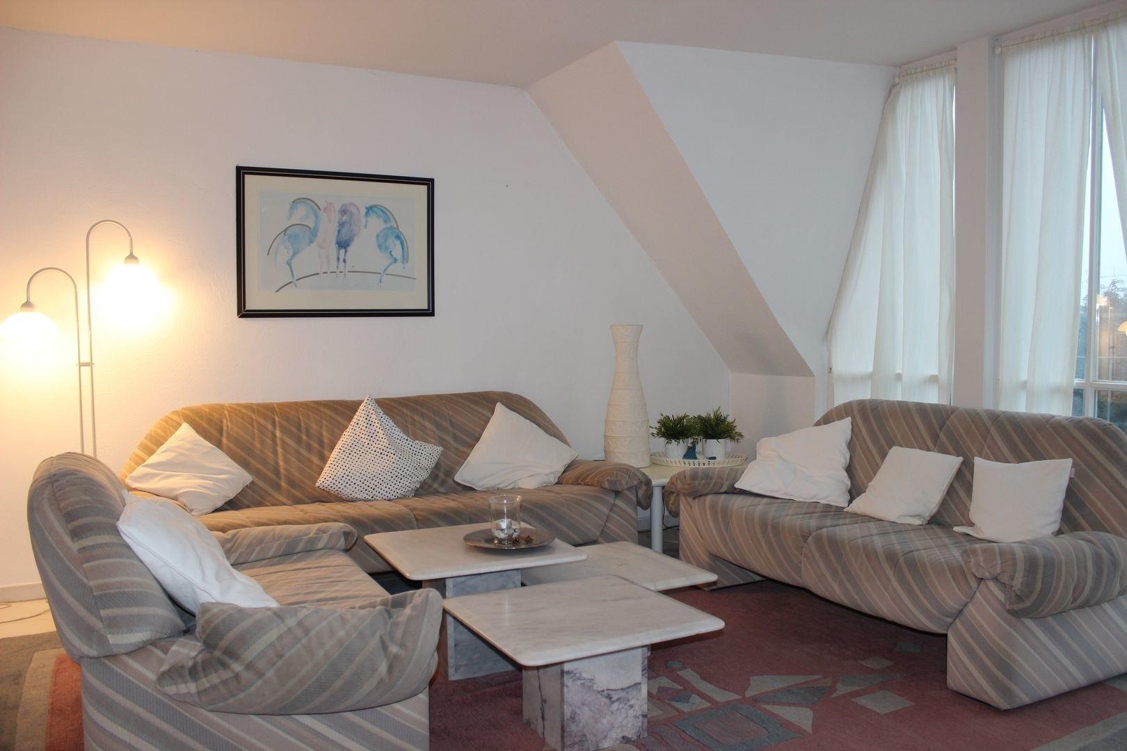 Die Wohnung verfügt im 1. OG über ein gemütliches Wohnzimmer mit Fliesen, Fernseher, Radio, CD, W-Lan & Balkonzugang. Ein Essplatz & eine gemütliche Couchecke laden zum Entspannen ein.