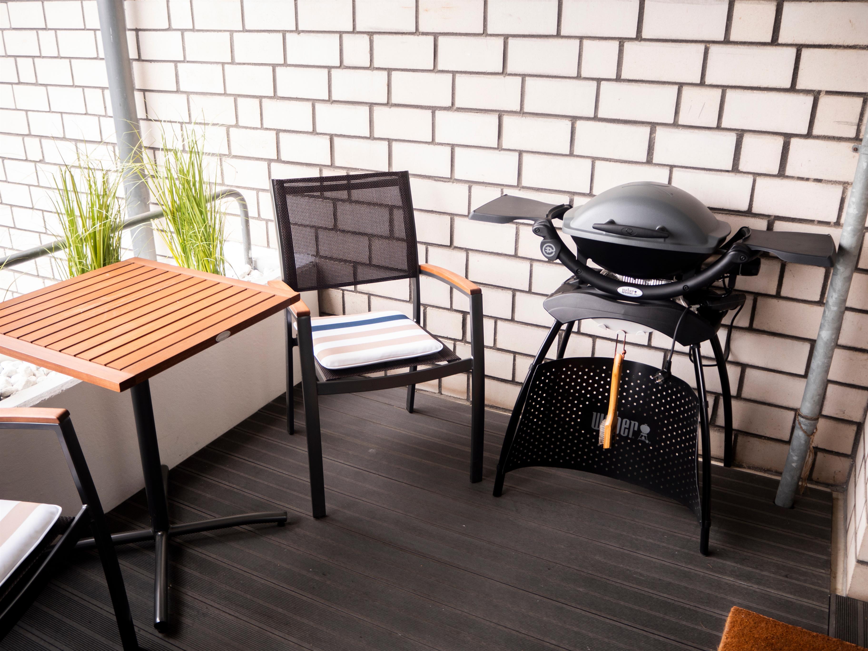 Von dem hellen Wohnzimmer mit Couchecke und einem Essbereich gelangt man auf den großen Balkon in Südost-Richtung mit gemütlicher Sitzecke. Ein Webergrill steht hier zur freien Verfügung.