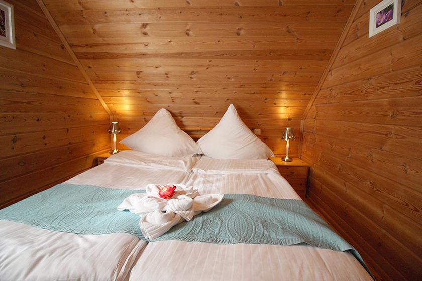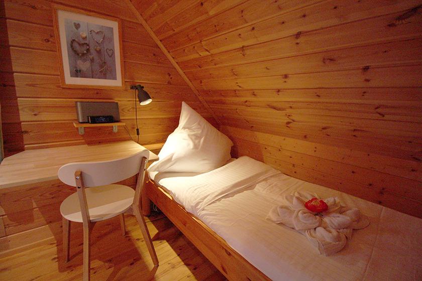 Im Obergeschoss befinden sich zwei separate Schlafzimmer. Ein Zimmer verfügt über ein Doppelbett (180 x 200 cm) und eine Babyschlafecke. Das zweite Schlafzimmer ist mit einem Einzelbett (90 x 200 cm) und einer Doppelschlafcouch (145 x 195) ausgestattet.
