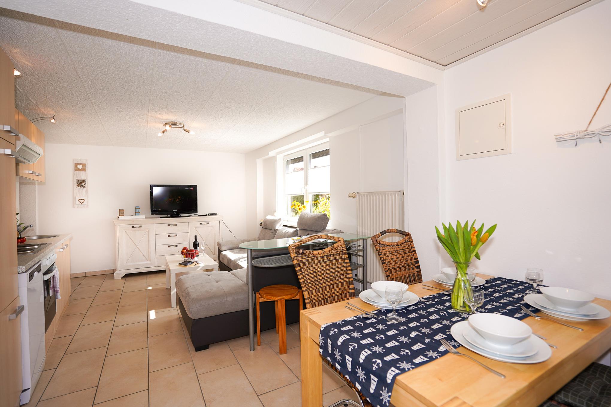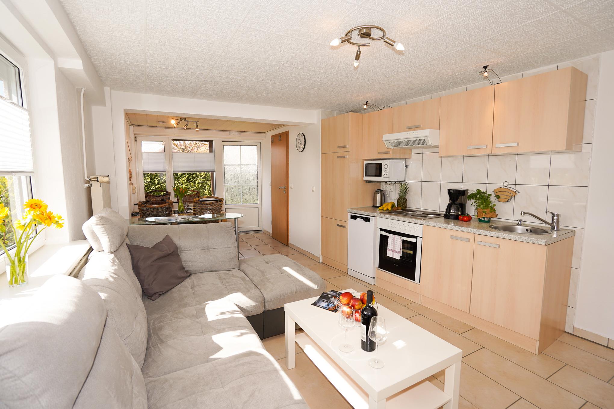 Die Wohnung verfügt über einen sehr hellen und offenen Wohn-/ Essbereich. Hier finden Sie eine große Couch, SAT-TV und Radio/CD und selbstverständlich kostenloses W-LAN vor. Die Küche ist mit einer Spülmaschine, Herd mit Backofen, Mikrowelle und diversen Elektrokleingeräten ausgestattet.