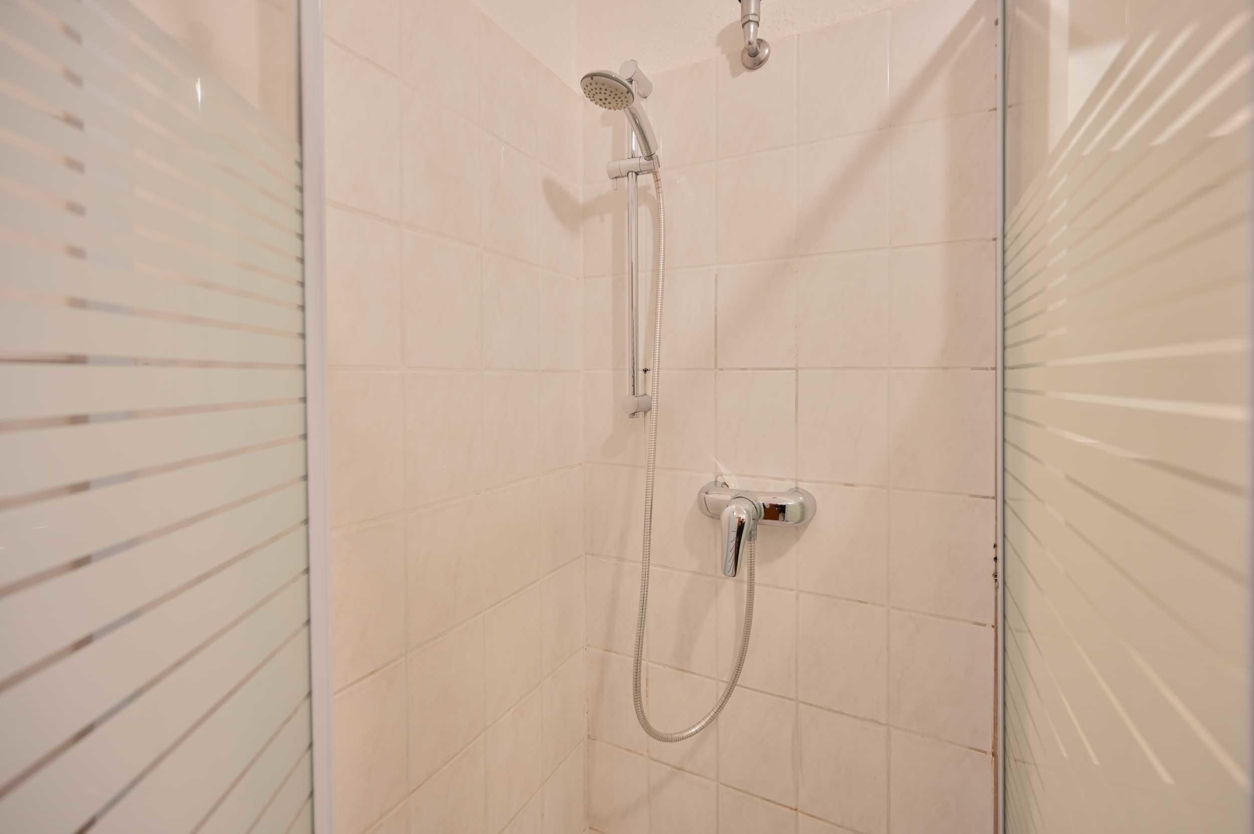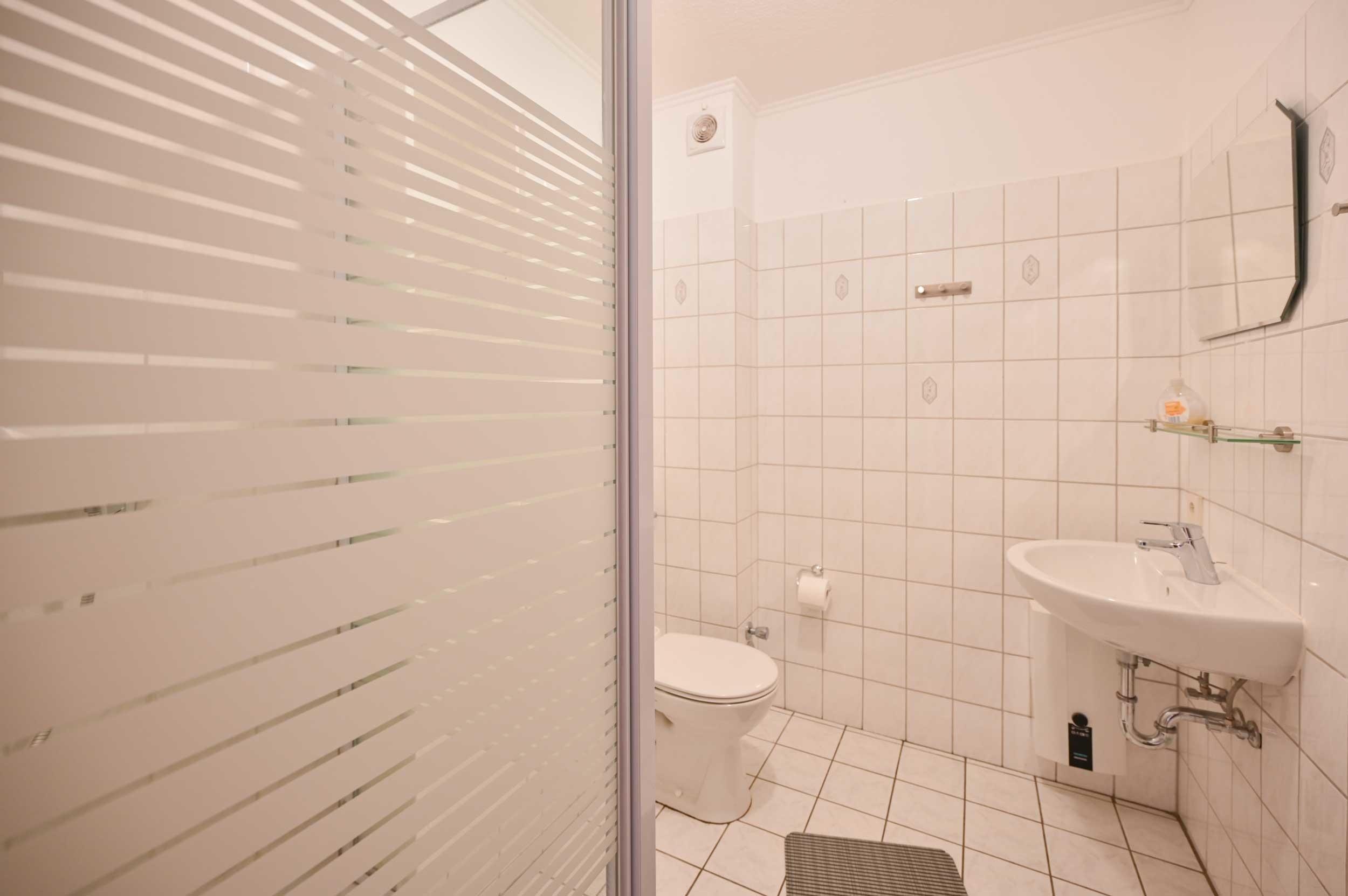Badezimmer mit Dusche, WC und Waschtisch.